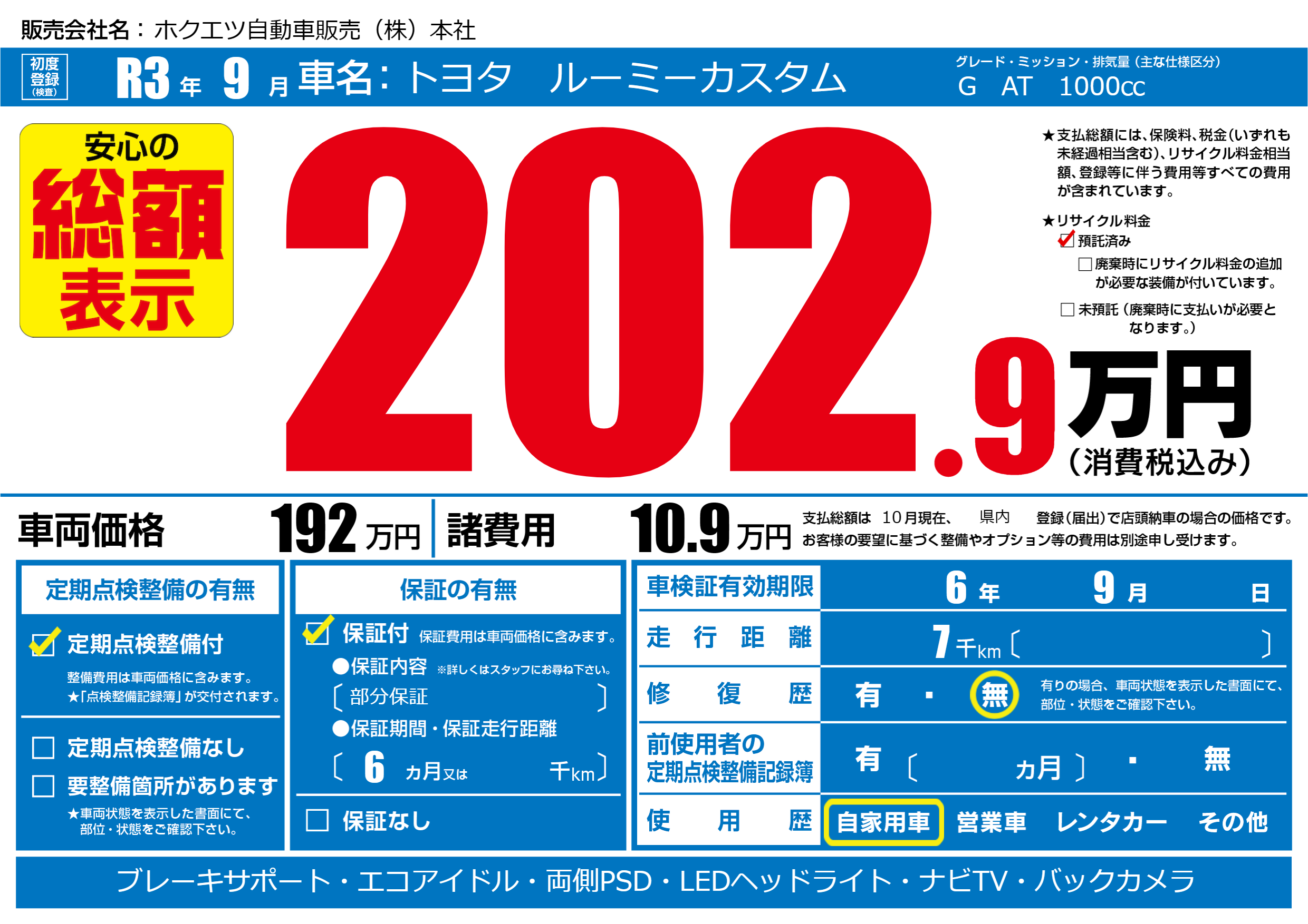| 車名 | トヨタ ルーミーカスタム | グレード ミッション 排気量 |