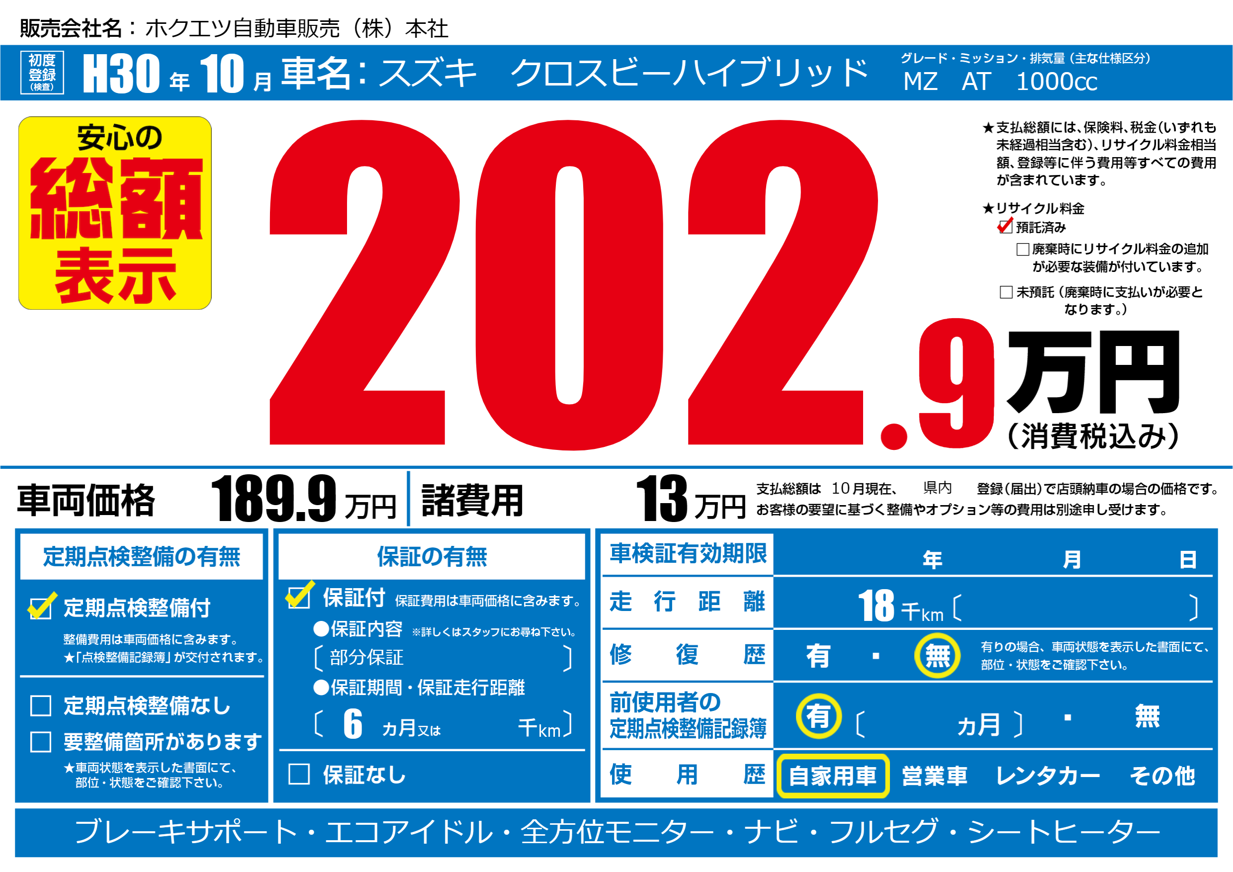 | 車名 | スズキ クロスビーハイブリッド | グレード ミッション 排気量 |