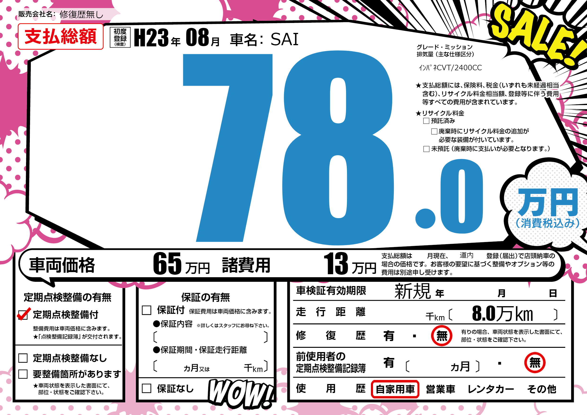| 走行キロ | - | 初年度登録 | H23年08月 |