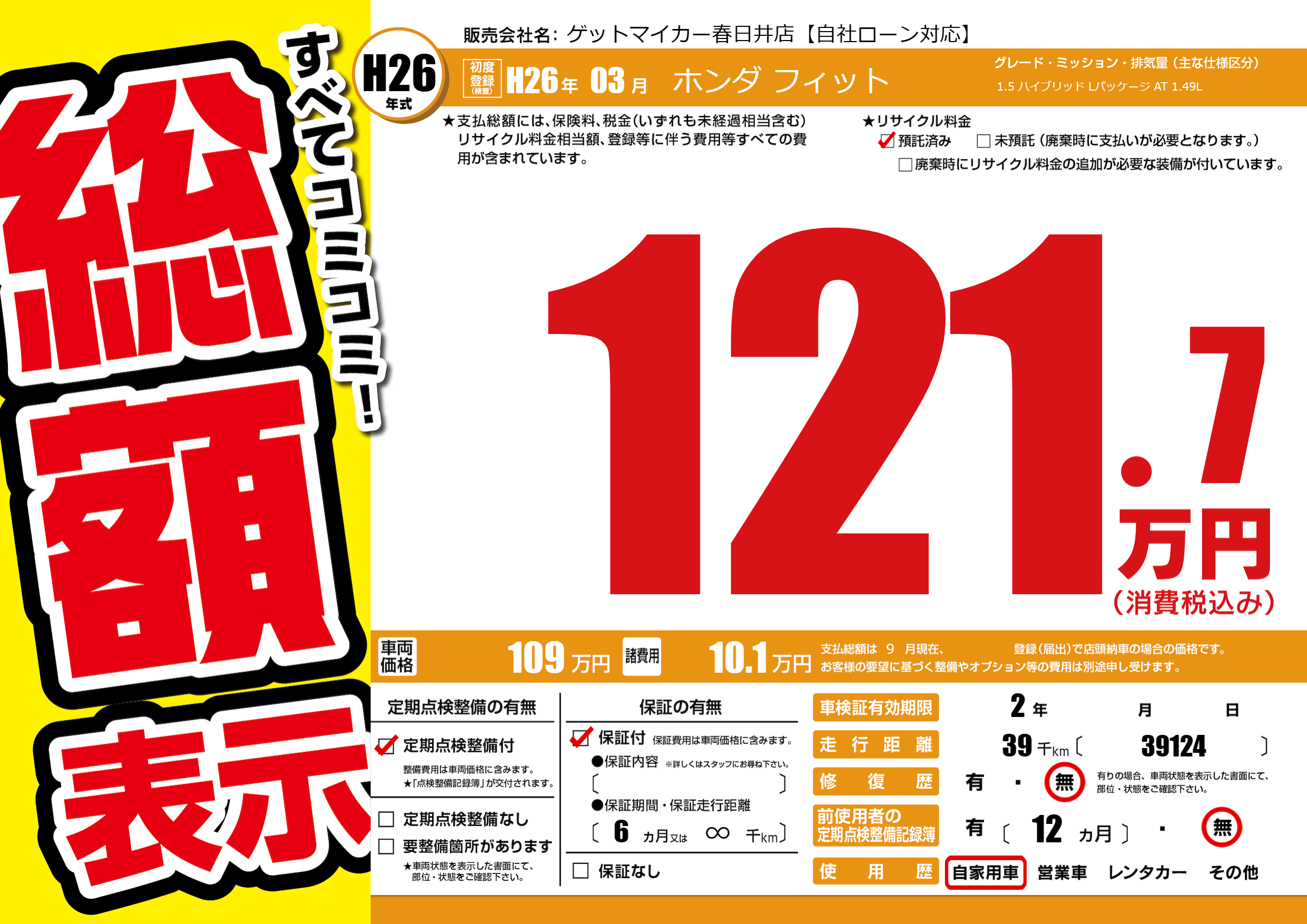 | 車名 | ホンダ フィット | グレード ミッション 排気量 |