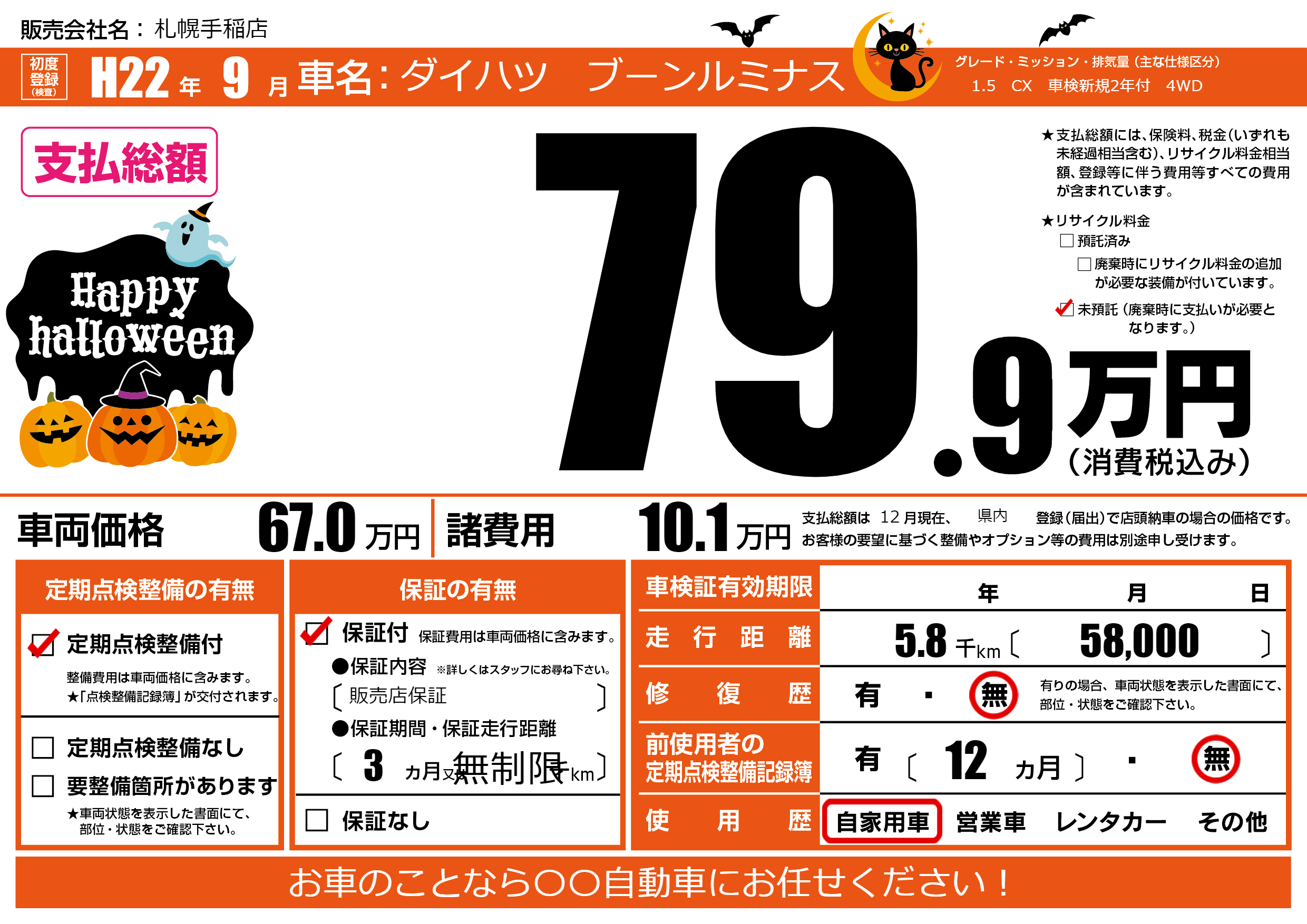 | 走行キロ | 0.5万km | 初年度登録 | H22年9月 |