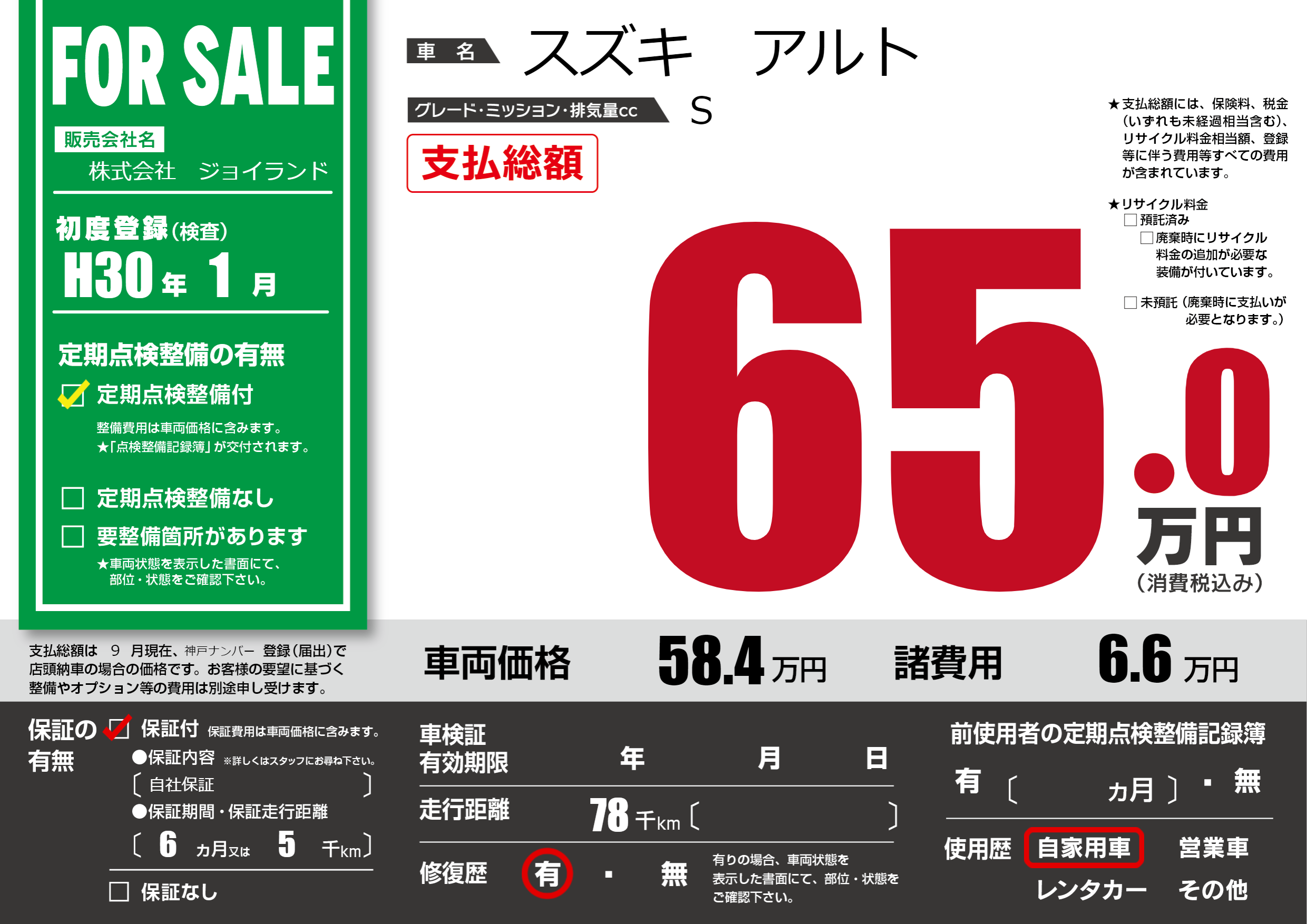| 走行キロ | 7.8万km | 初年度登録 | H30年1月 |