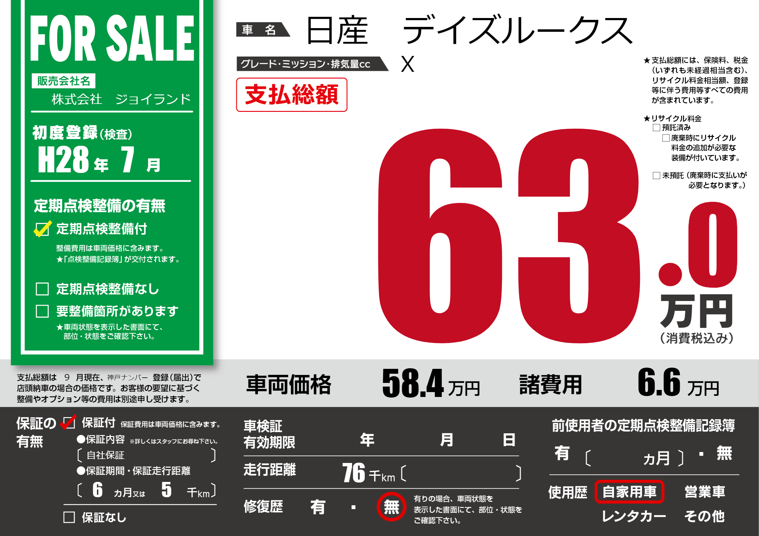 | 走行キロ | 7.6万km | 初年度登録 | H28年7月 |