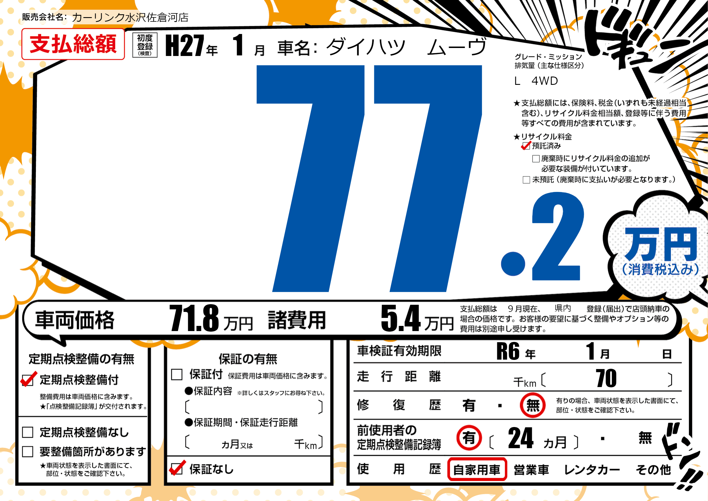 | 車名 | ダイハツ ムーヴ | グレード ミッション 排気量 |