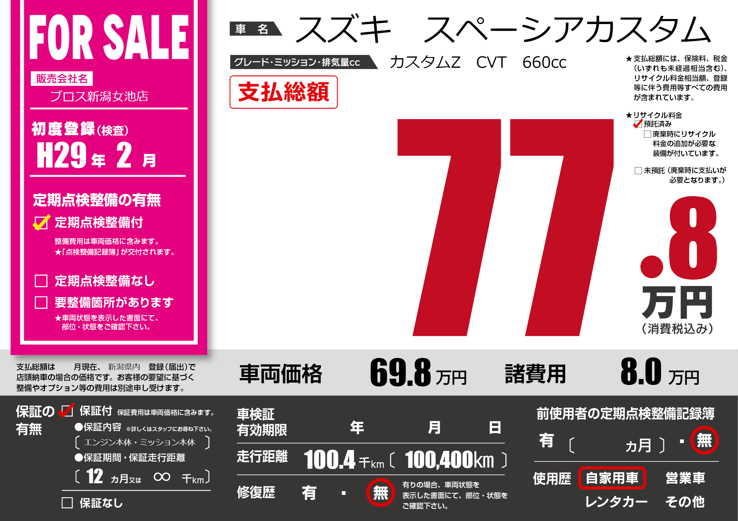 | 走行キロ | 10万km | 初年度登録 | H29年2月 |