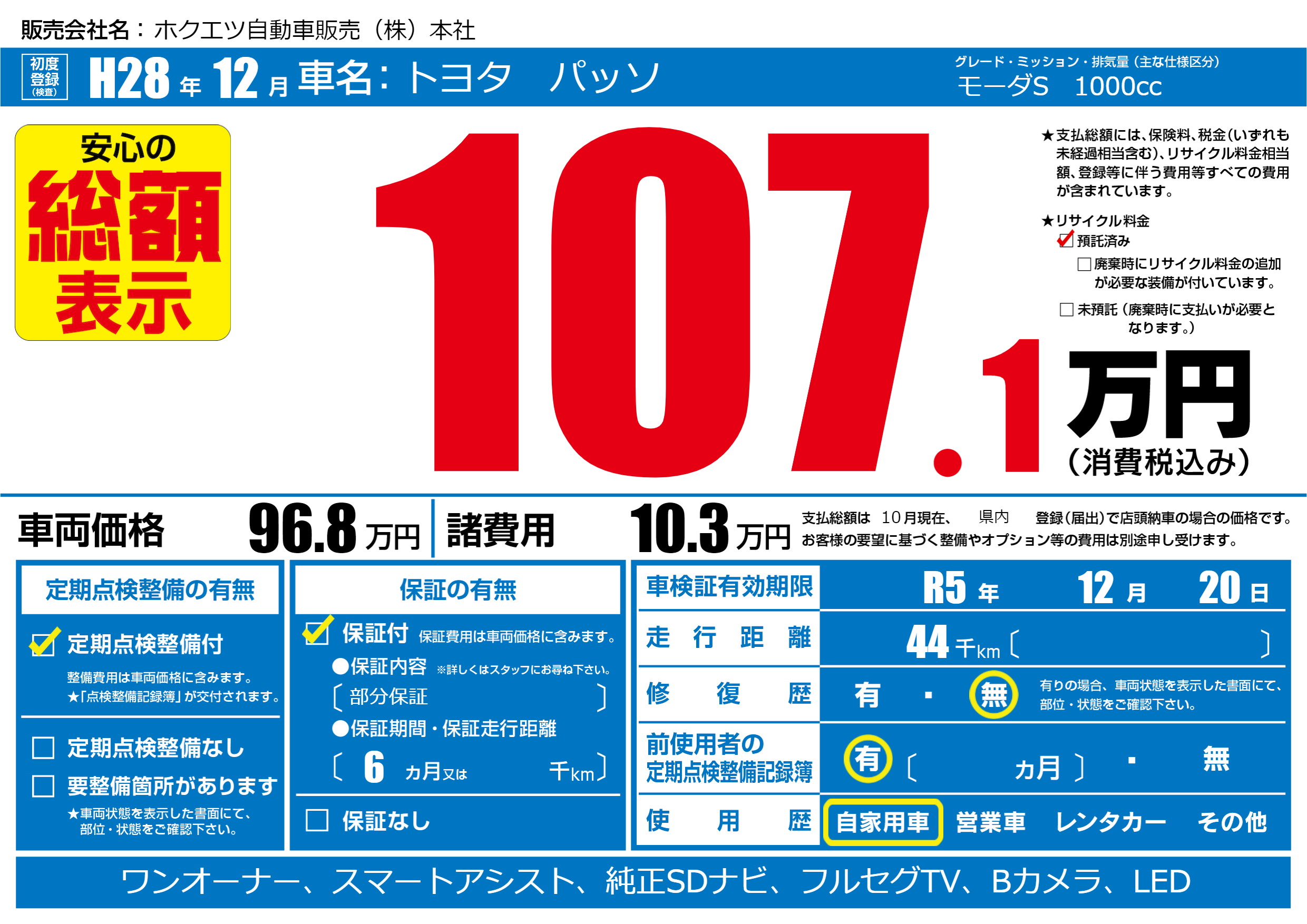 | 車名 | トヨタ パッソ | グレード ミッション 排気量 |