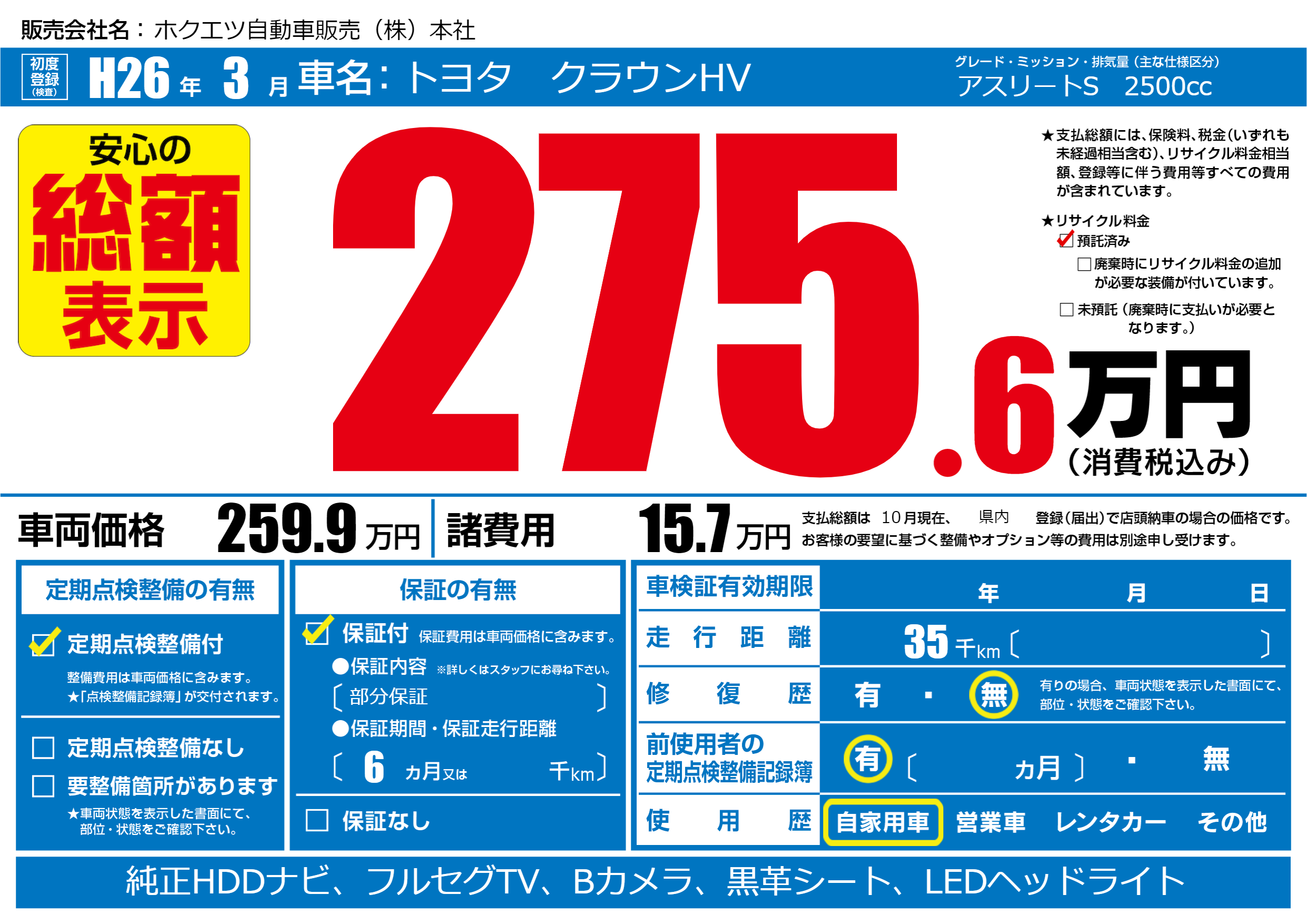 | 車名 | トヨタ クラウンHV | グレード ミッション 排気量 |