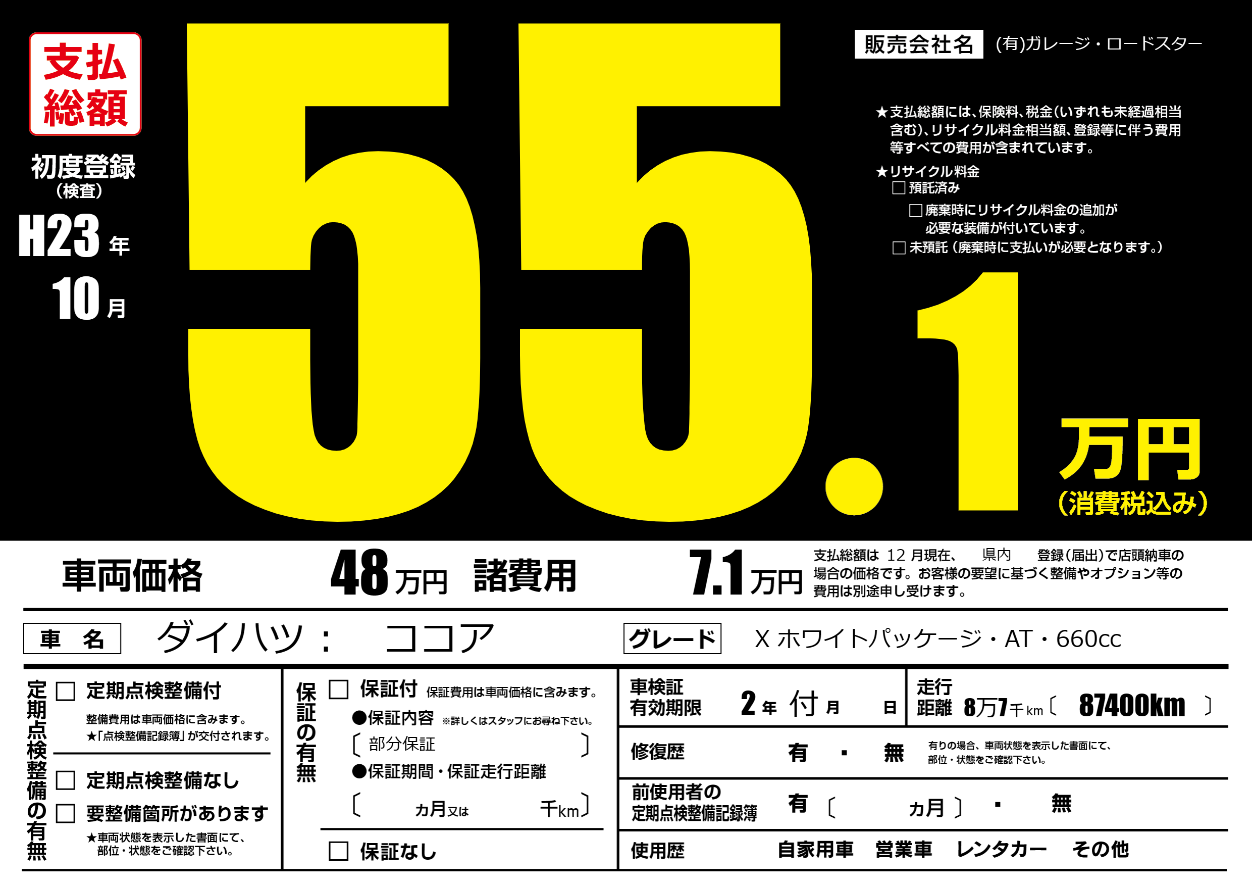 | 走行キロ | 0.8万km | 初年度登録 | H23年10月 |