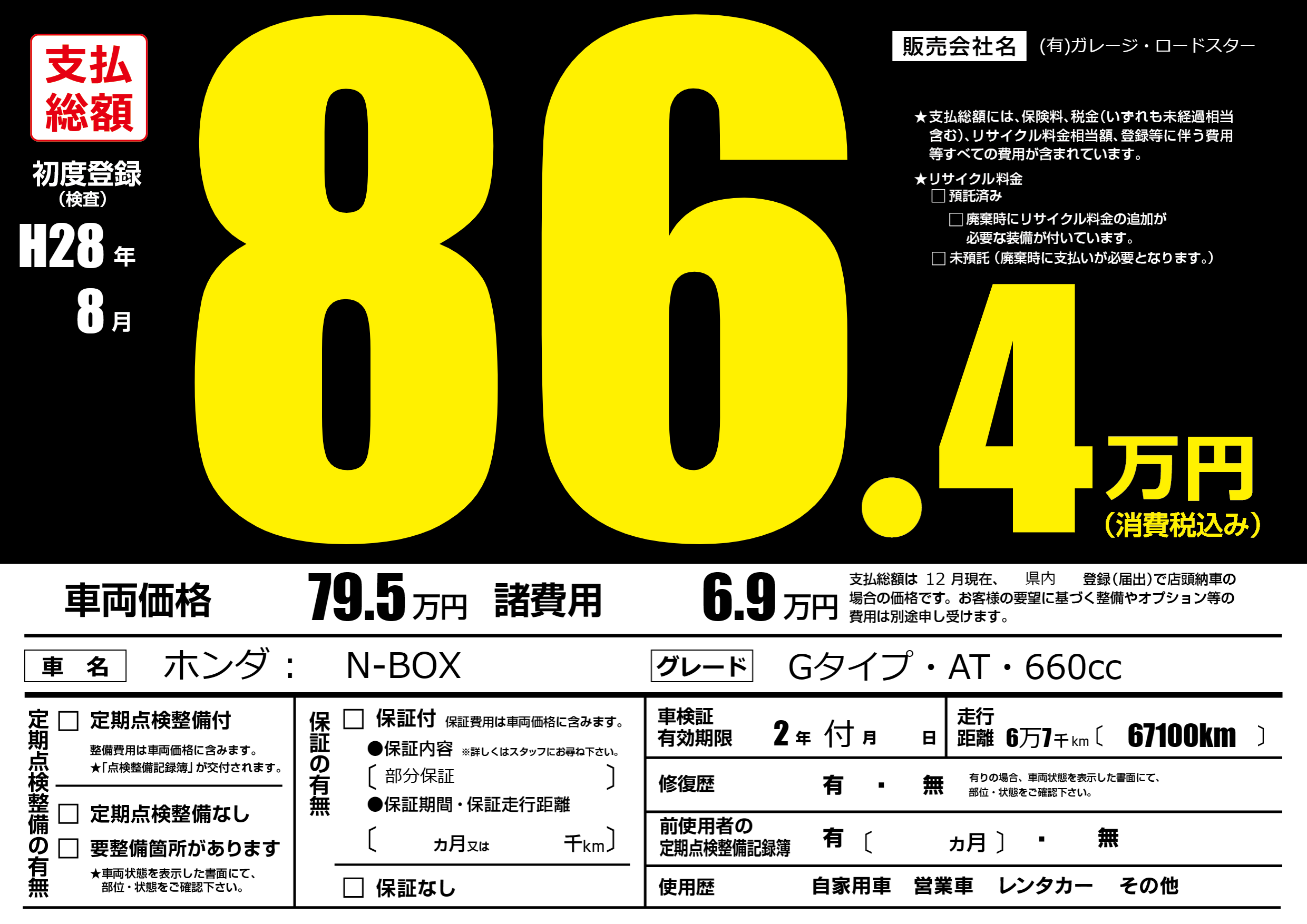 保証なし 保証内容(部分保証) ---ヶ月または()千kmまで |