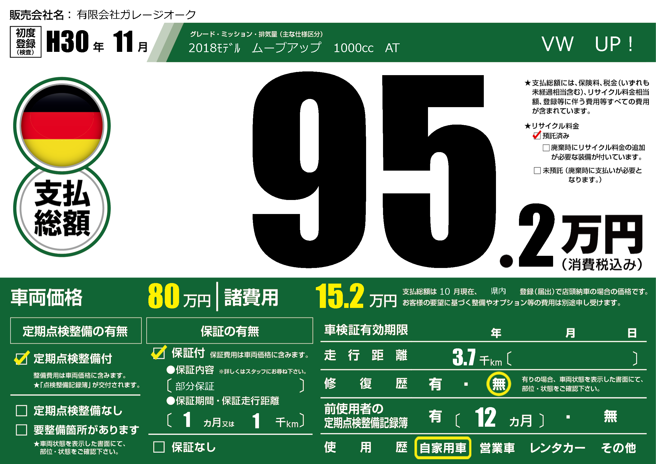 | 車名 | VW UP! | グレード ミッション 排気量 |