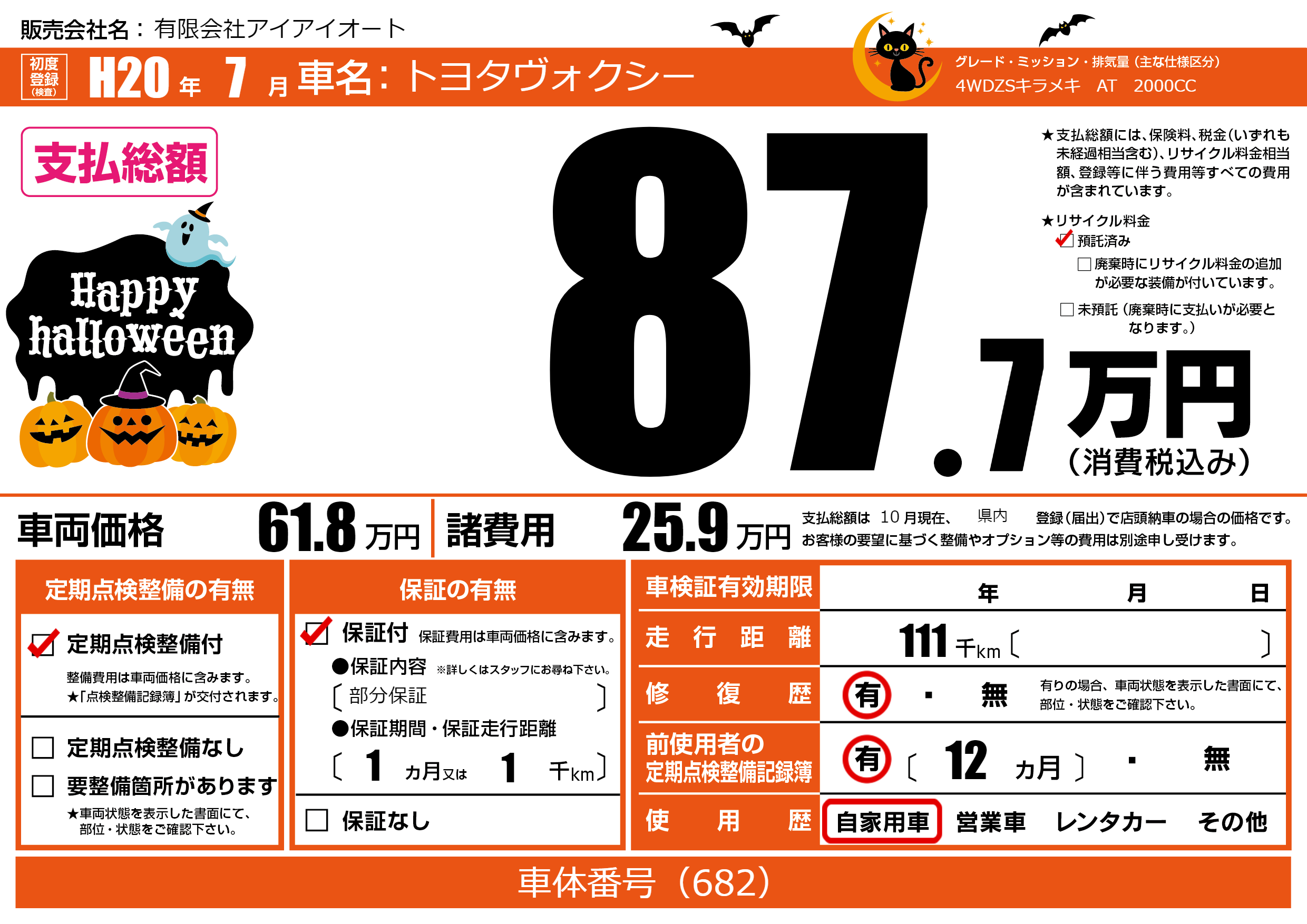 | 走行キロ | 11.1万km | 初年度登録 | H20年7月 |