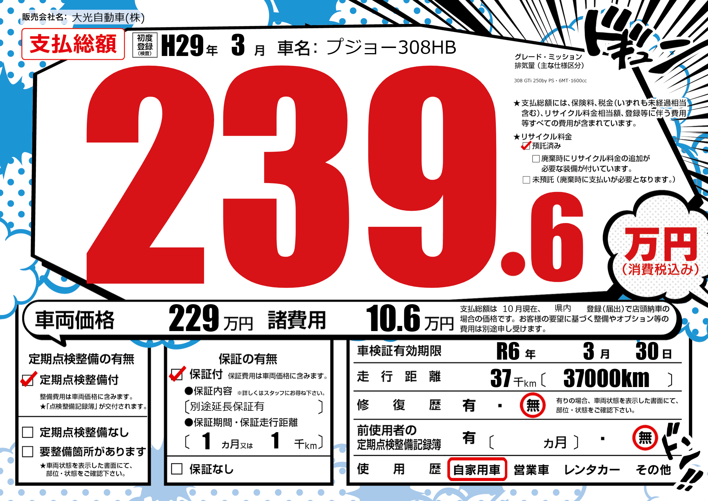 | 車名 | プジョー308HB | グレード ミッション 排気量 |
