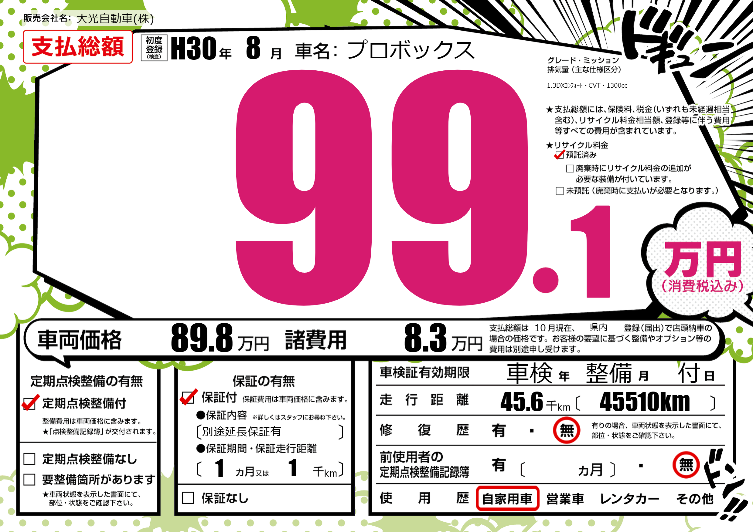 | 車名 | プロボックス | グレード ミッション 排気量 |
