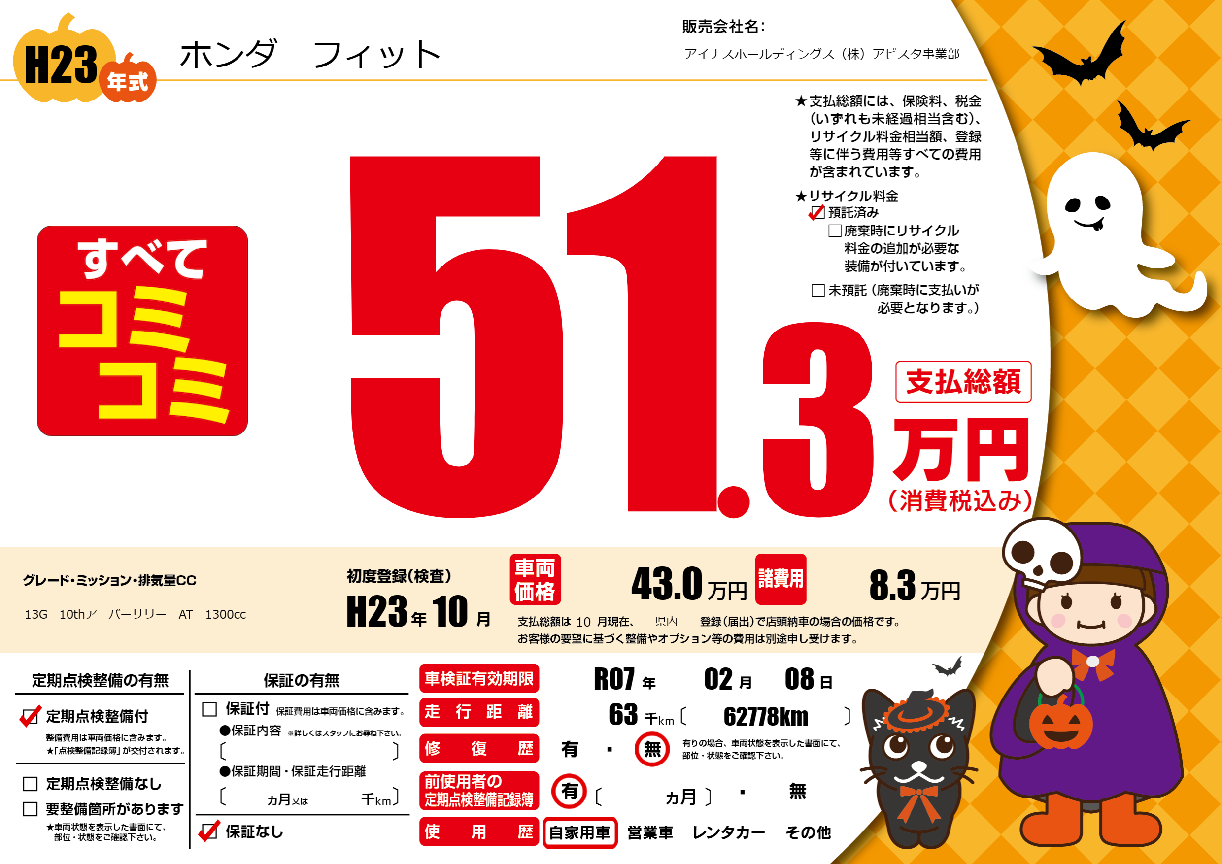 | 走行キロ | 6.3万km | 初年度登録 | H23年10月 |