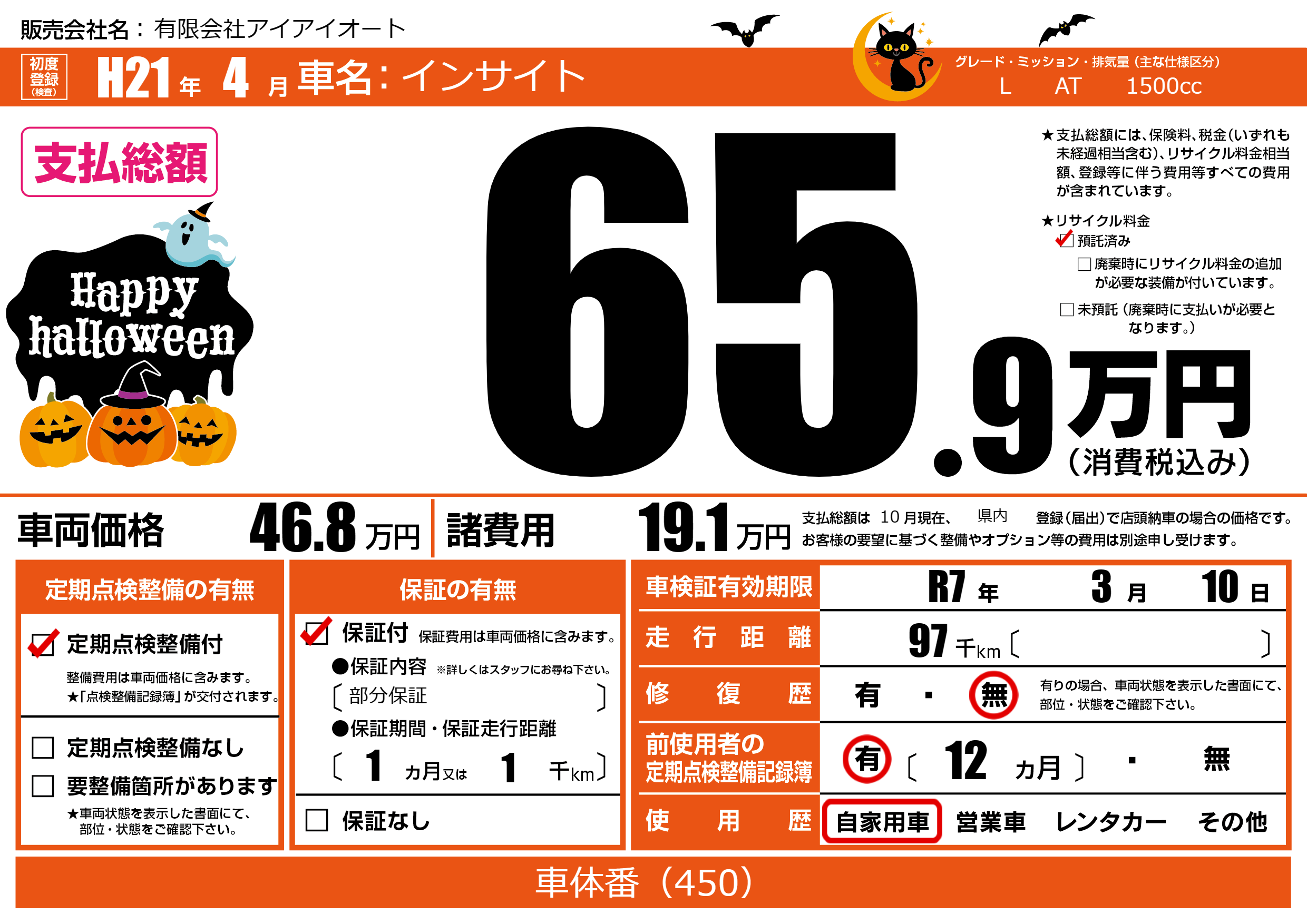 | 車名 | インサイト | グレード ミッション 排気量 |