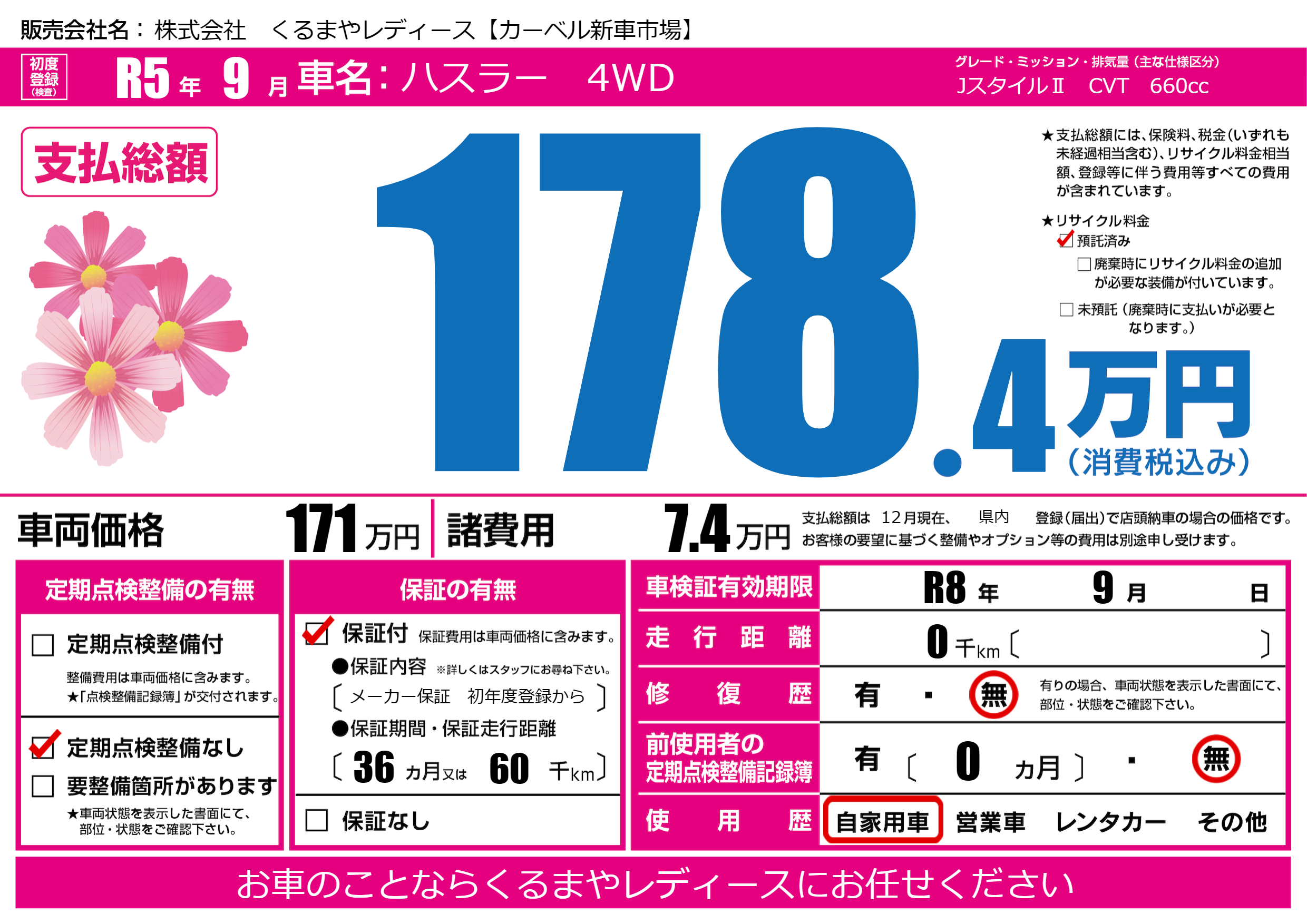 | 車名 | ハスラー 4WD | グレード ミッション 排気量 |