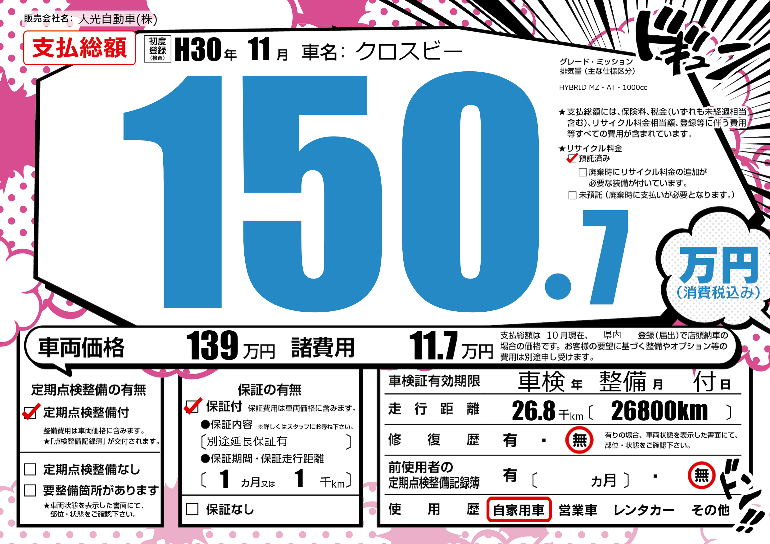 | 走行キロ | 2.6万km | 初年度登録 | H30年11月 |