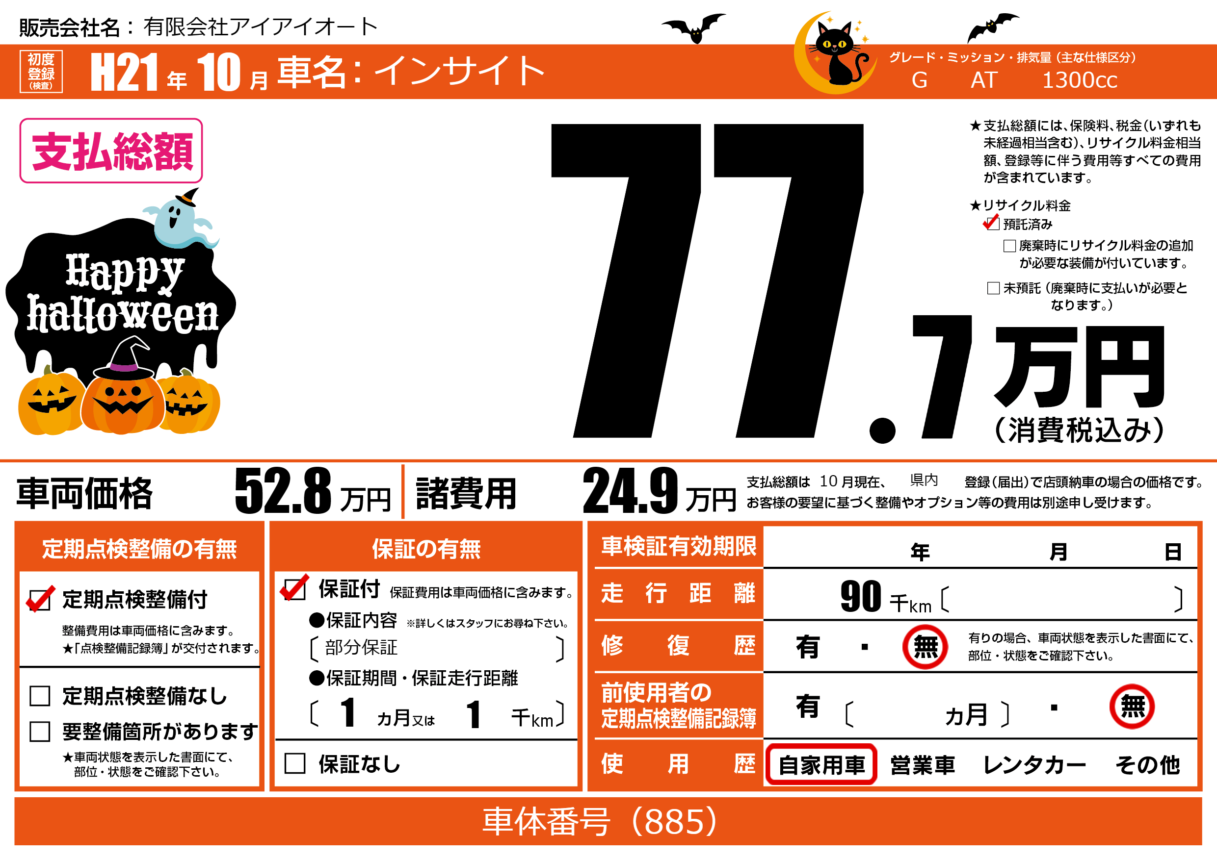| 走行キロ | 9万km | 初年度登録 | H21年10月 |