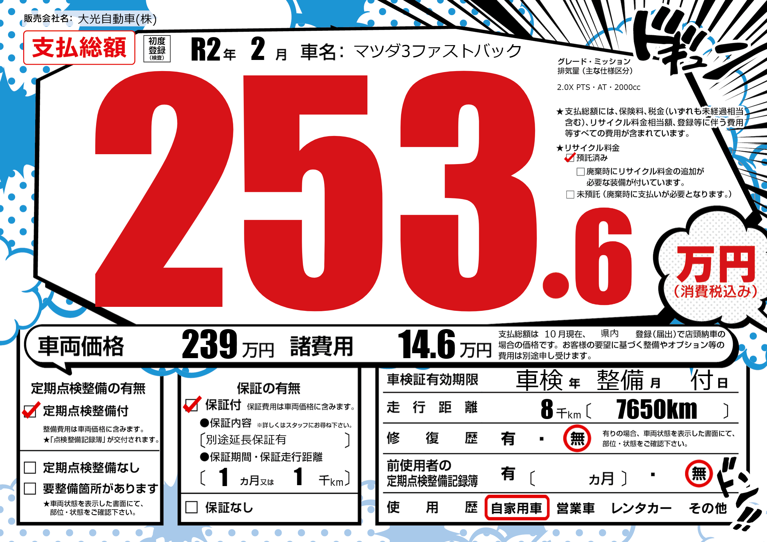 | 車名 | マツダ3ファストバック | グレード ミッション 排気量 |