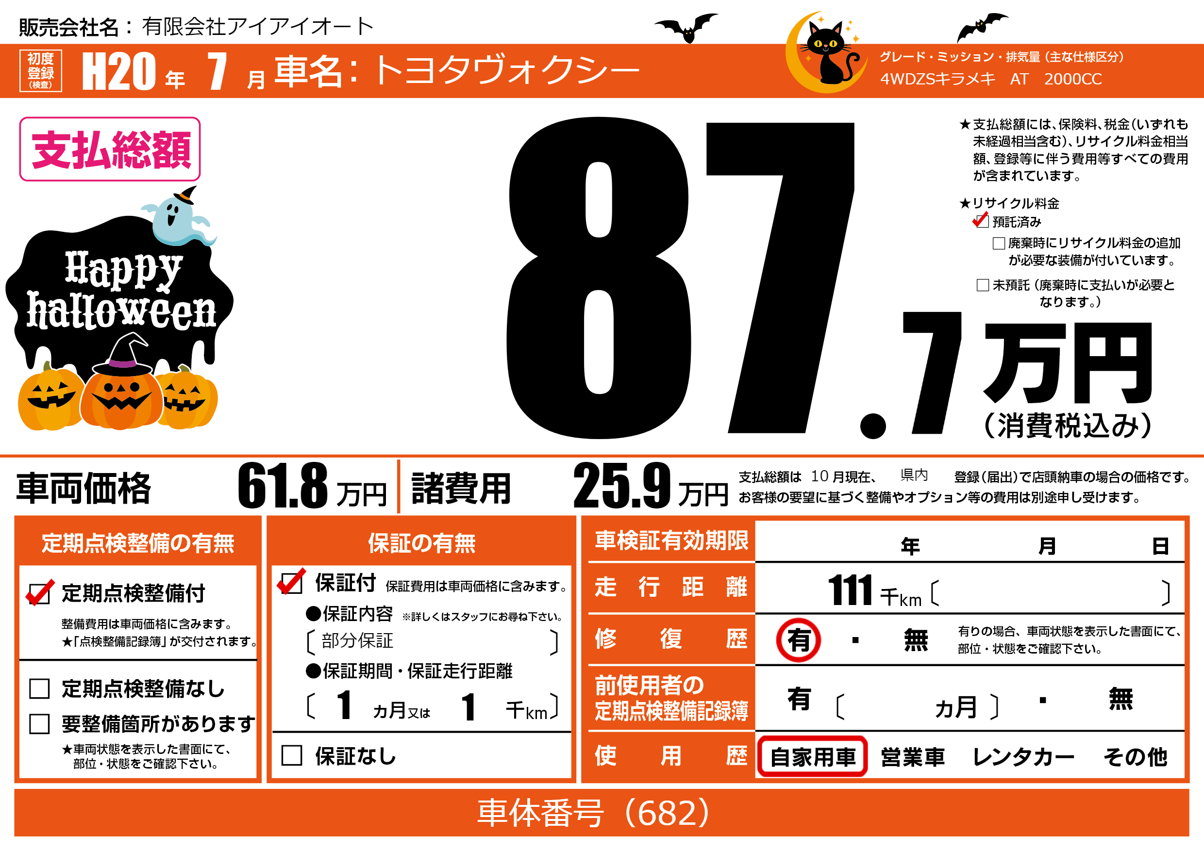 | 走行キロ | 11.1万km | 初年度登録 | H20年7月 |