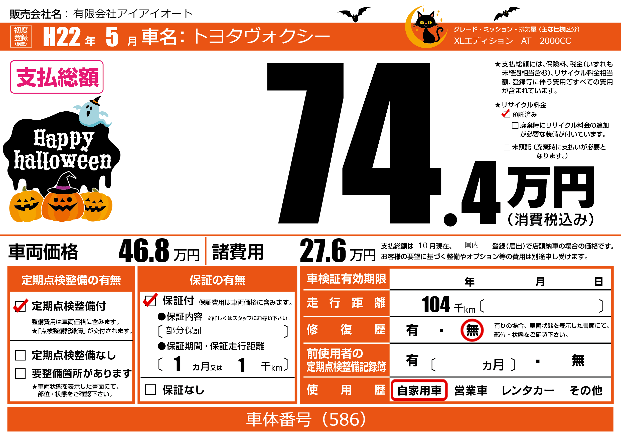 | 走行キロ | 10.4万km | 初年度登録 | H22年5月 |