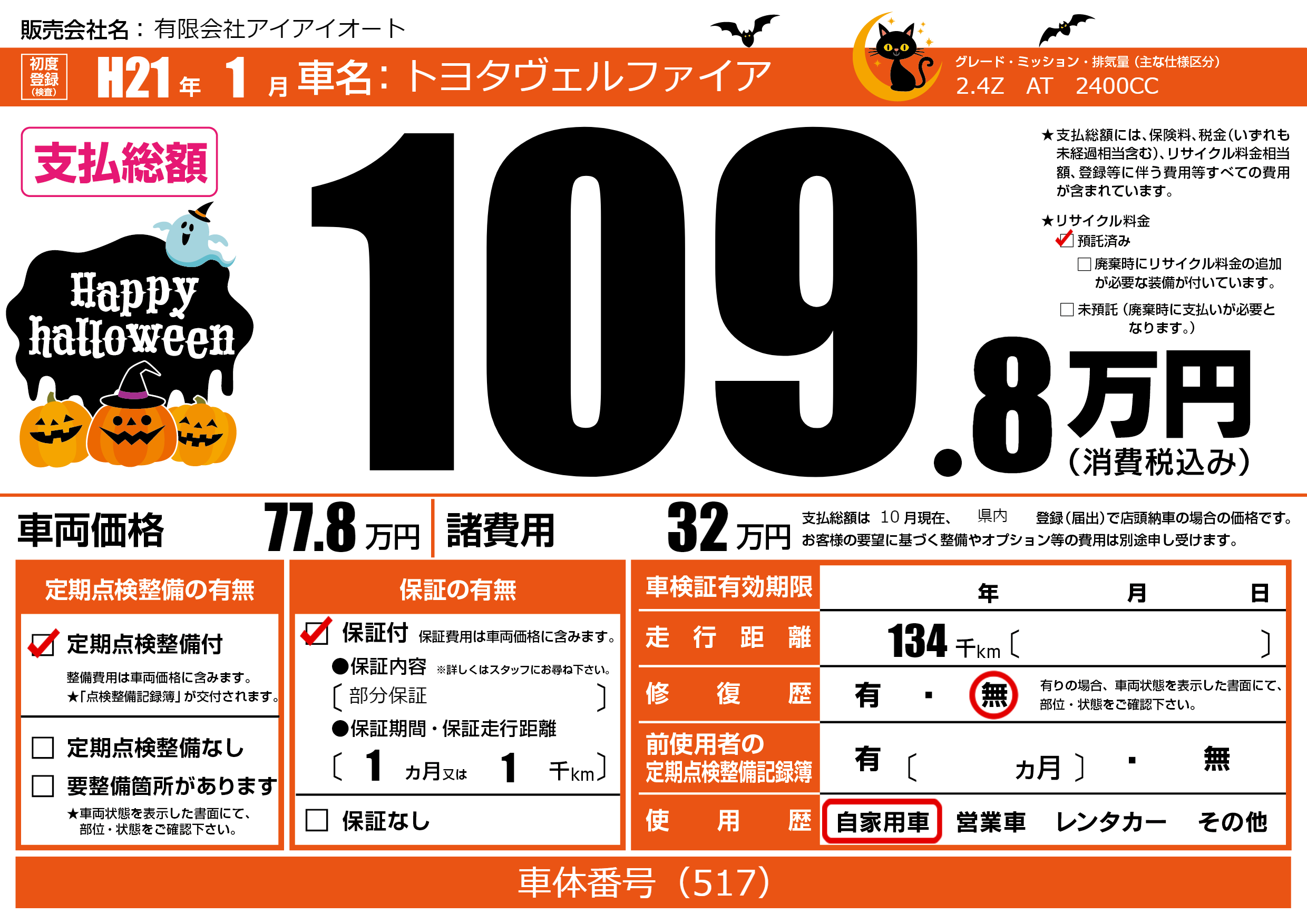 | 車名 | トヨタヴェルファイア | グレード ミッション 排気量 |