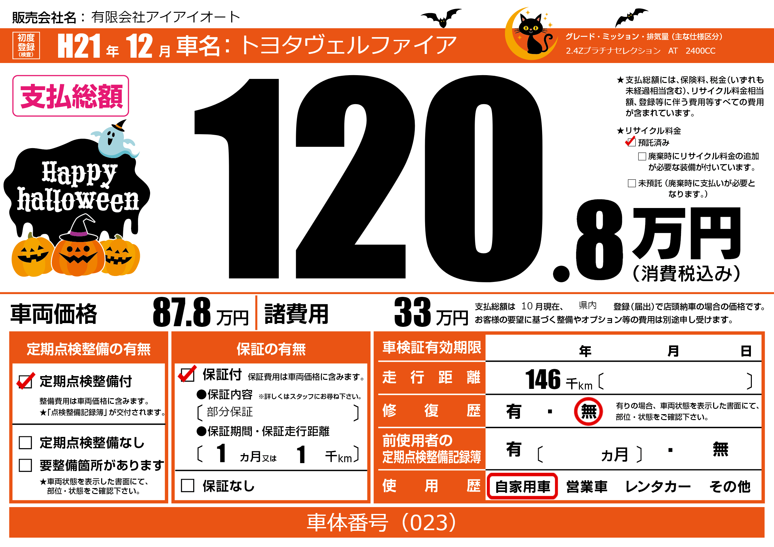 | 走行キロ | 14.6万km | 初年度登録 | H21年12月 |