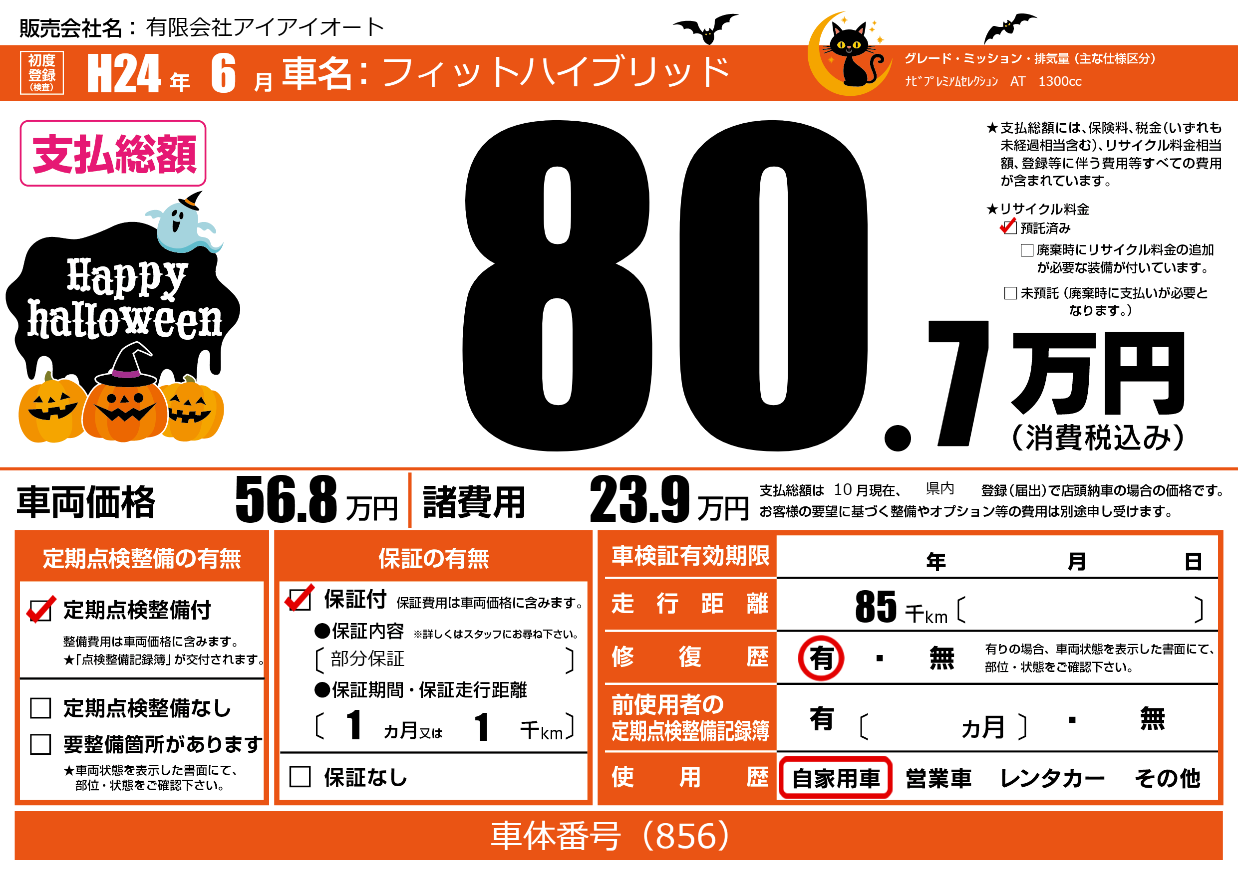 | 走行キロ | 8.5万km | 初年度登録 | H24年6月 |
