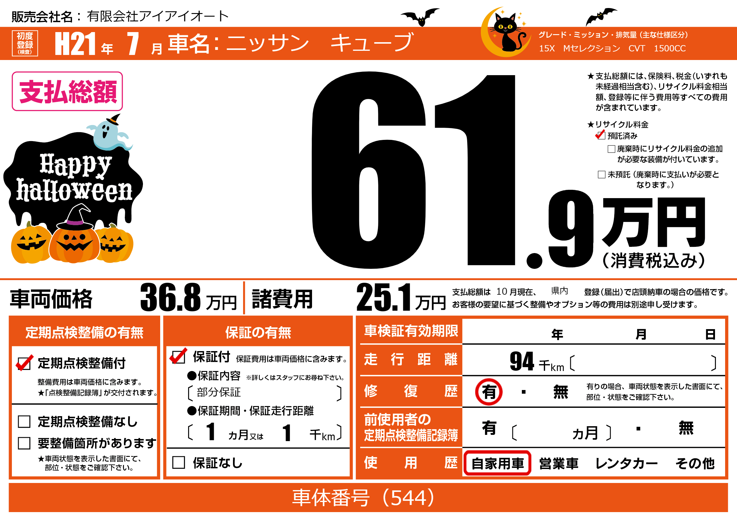 | 走行キロ | 9.4万km | 初年度登録 | H21年7月 |