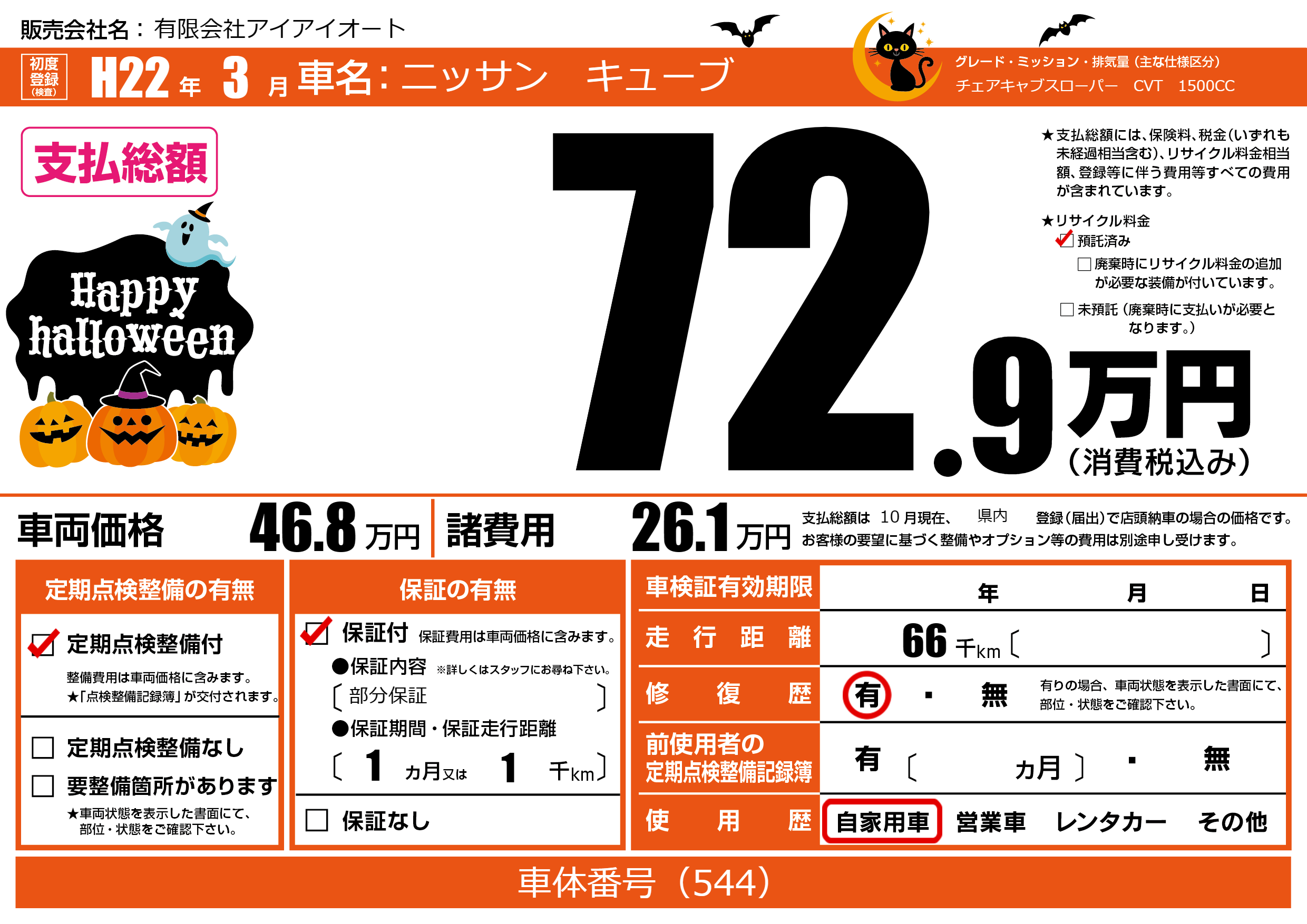 | 走行キロ | 6.6万km | 初年度登録 | H22年3月 |