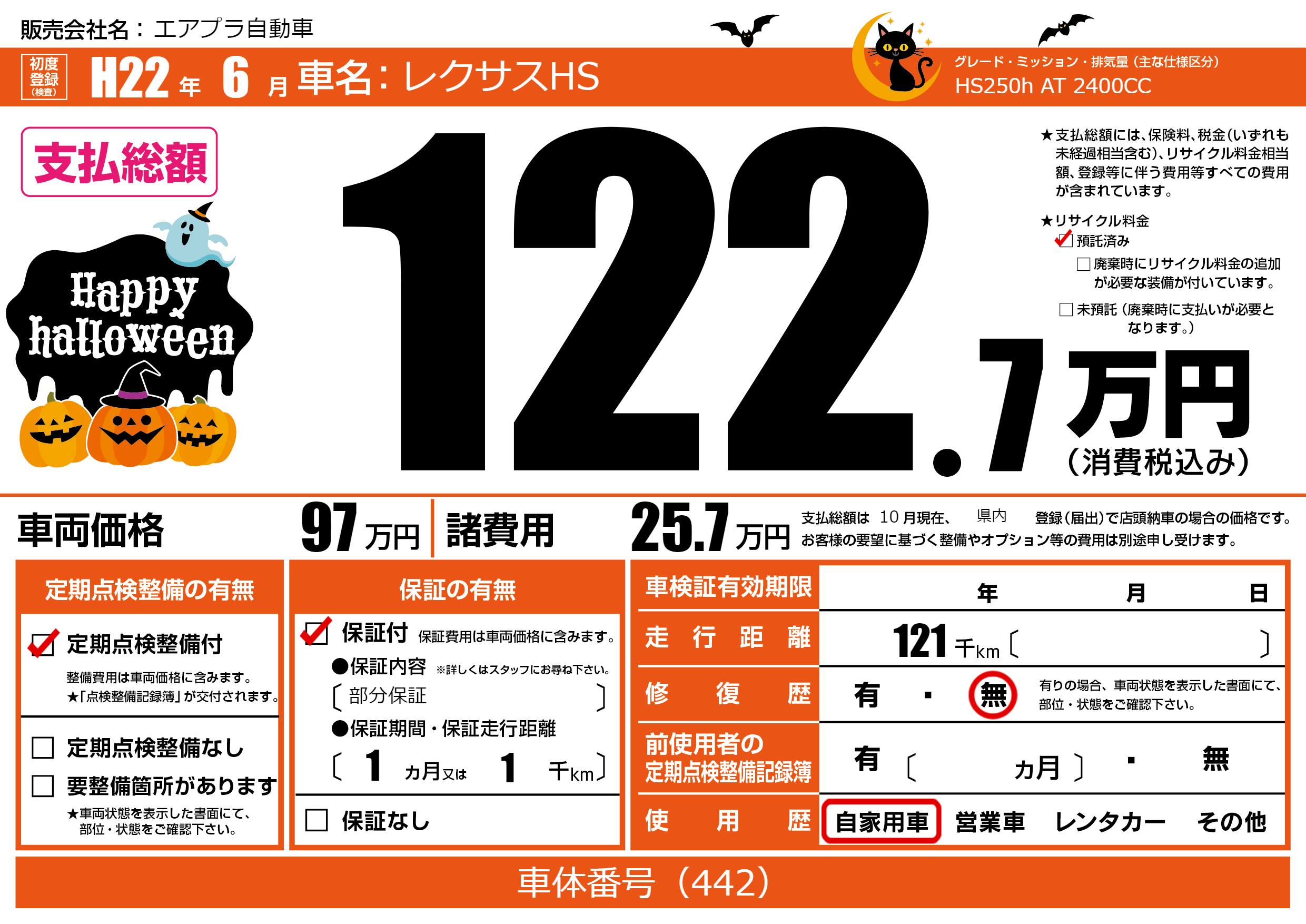 | 走行キロ | 12.1万km | 初年度登録 | H22年6月 |