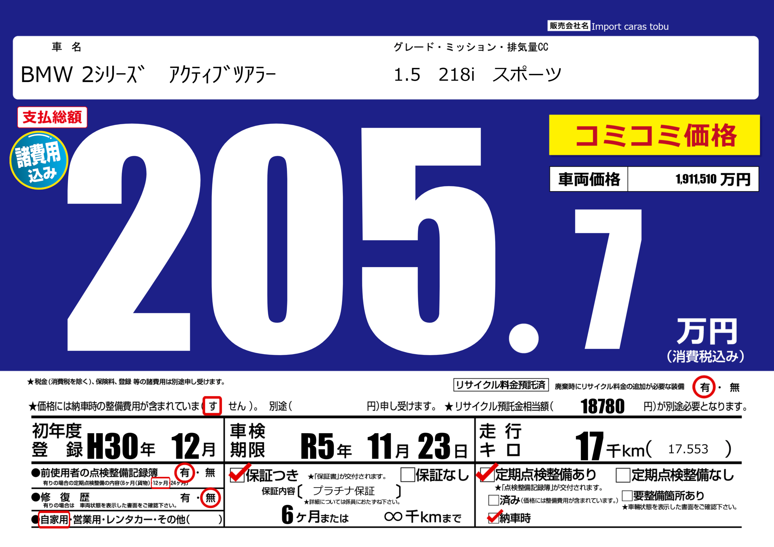 保証付き 保証内容( プラチナ保証) 6ヶ月または(∞)千kmまで |