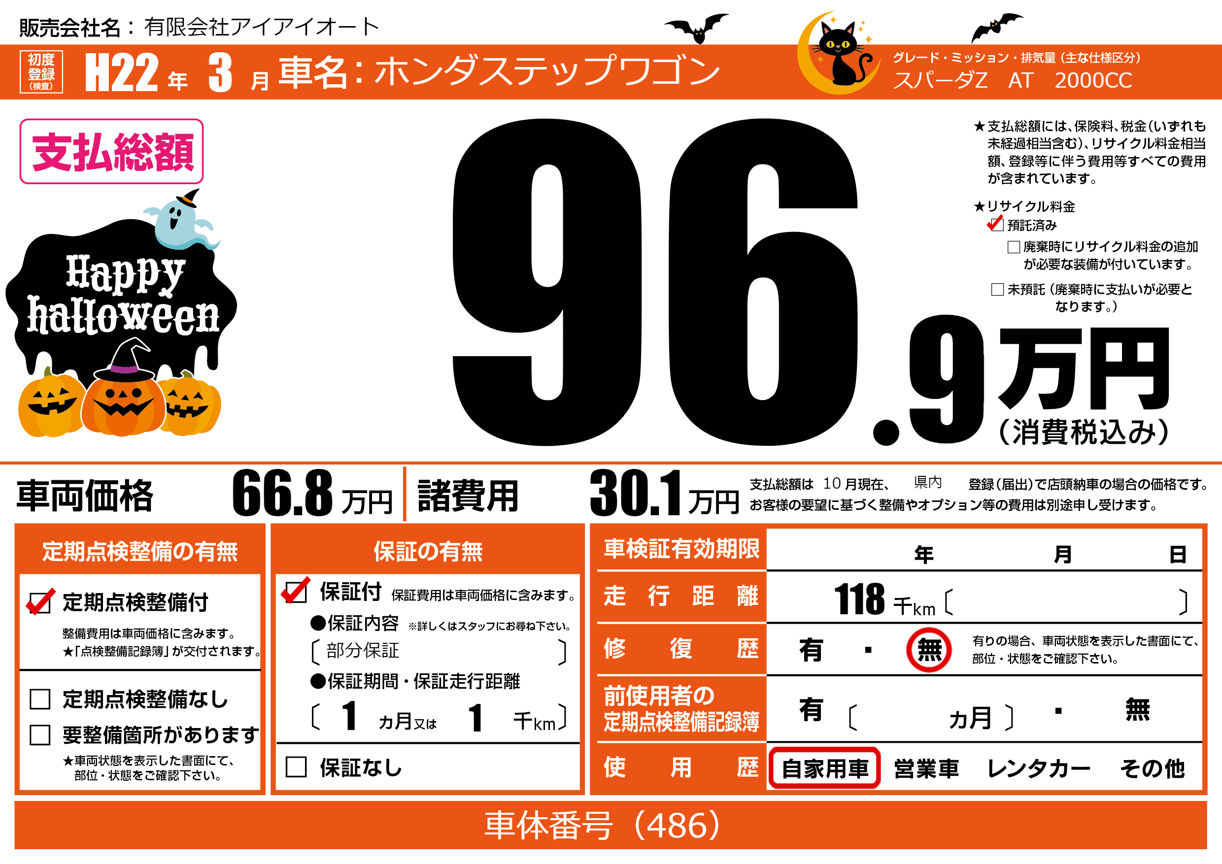 | 走行キロ | 11.8万km | 初年度登録 | H22年3月 |
