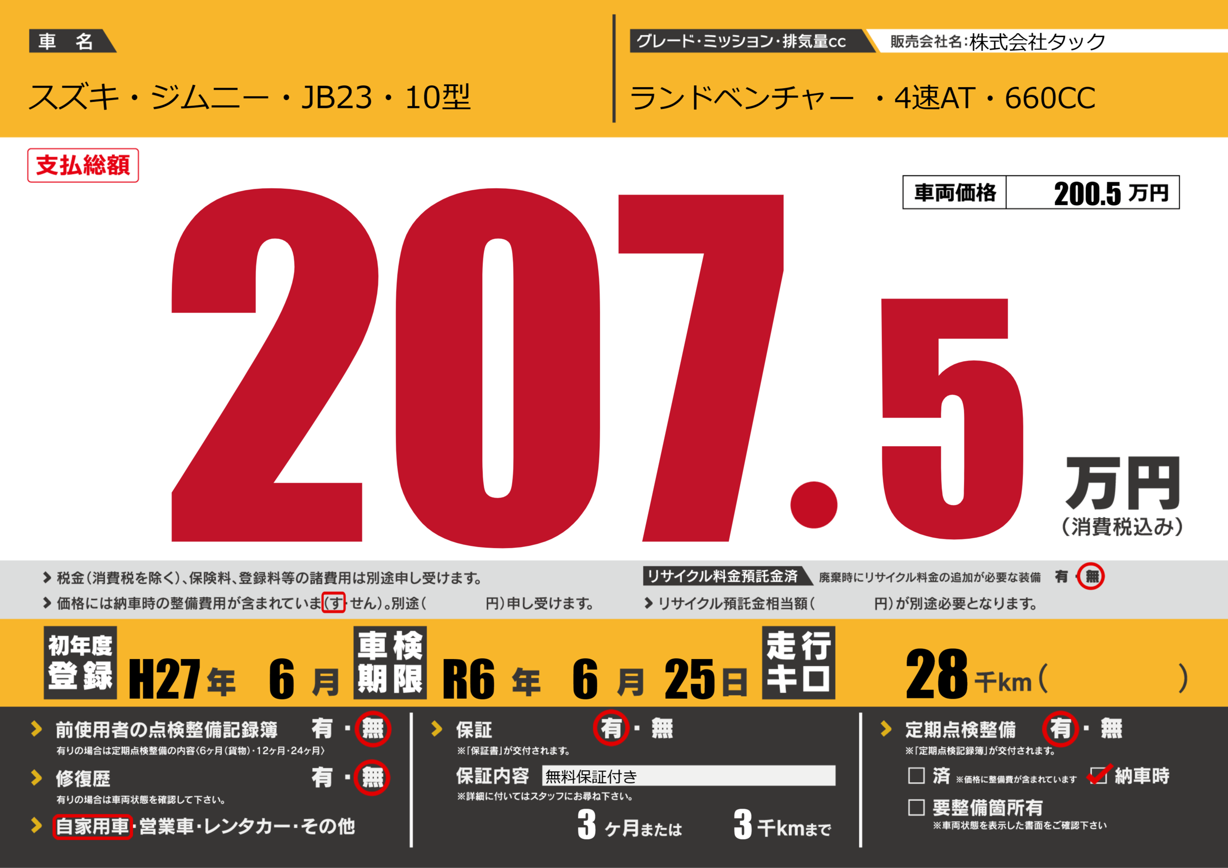 保証なし 保証内容(無料保証付き) 3ヶ月または(3)千kmまで |