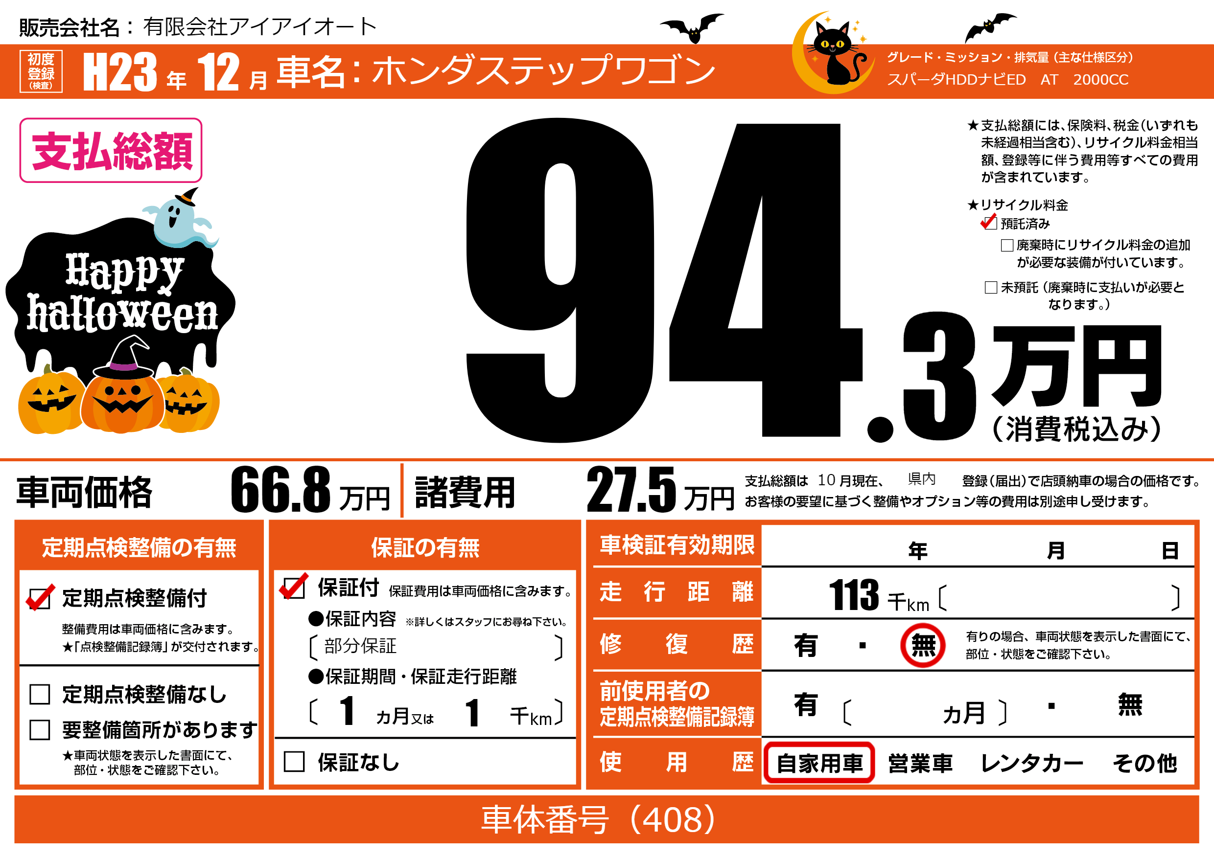 | 走行キロ | 11.3万km | 初年度登録 | H23年12月 |