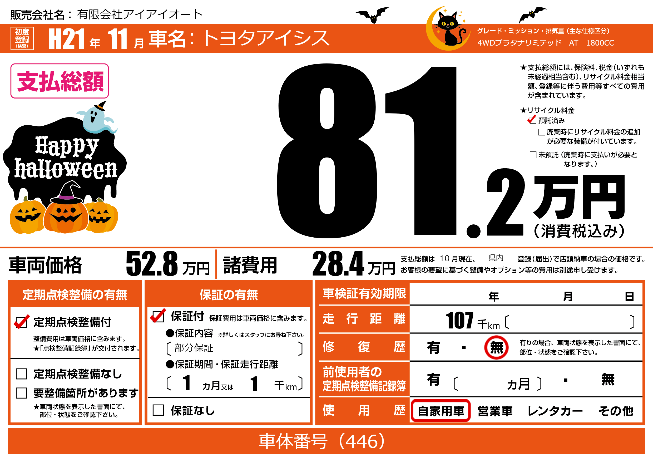 | 走行キロ | 10.7万km | 初年度登録 | H21年11月 |