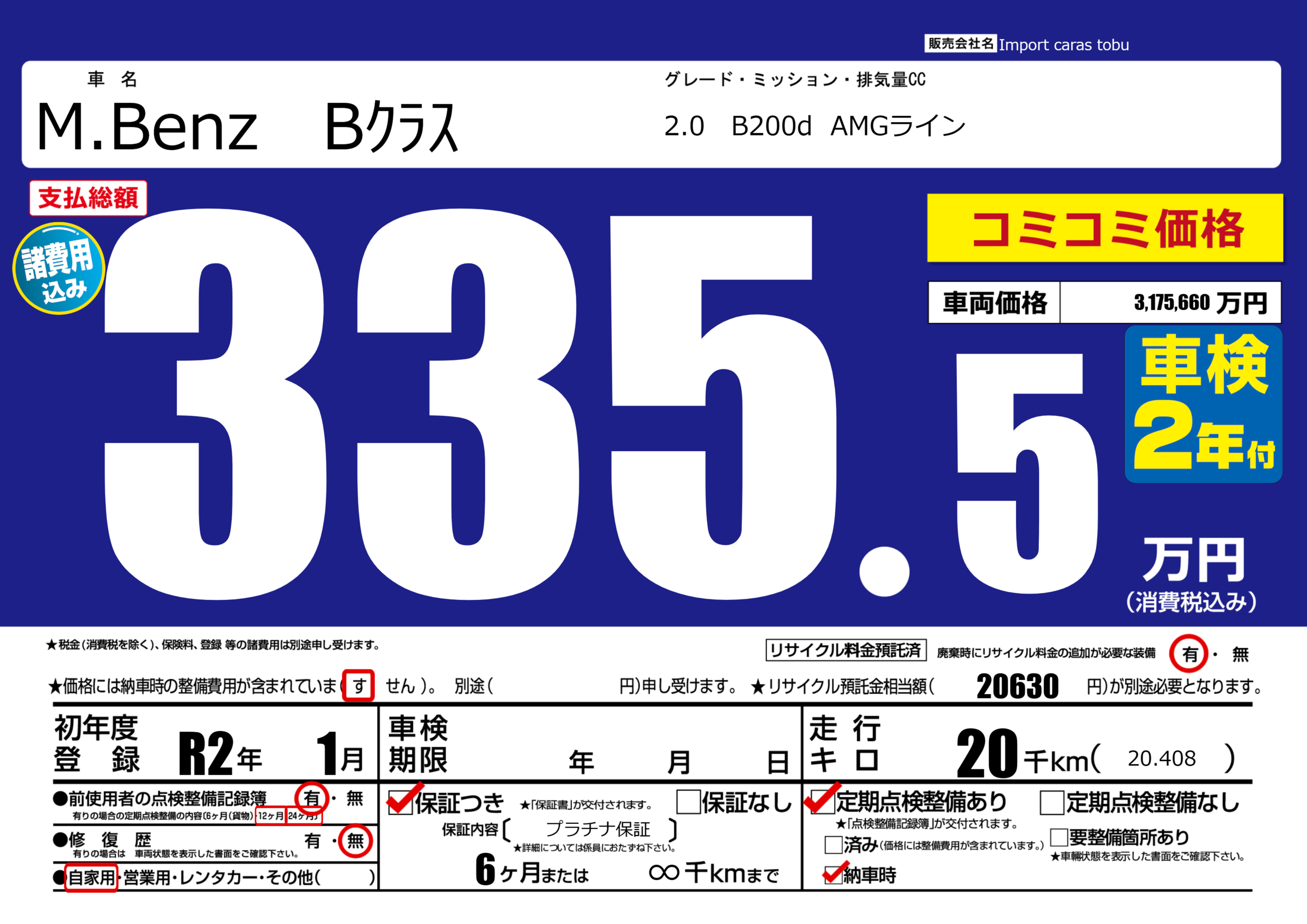 | 車名 | M.Benz Bクラス | グレード ミッション 排気量 |