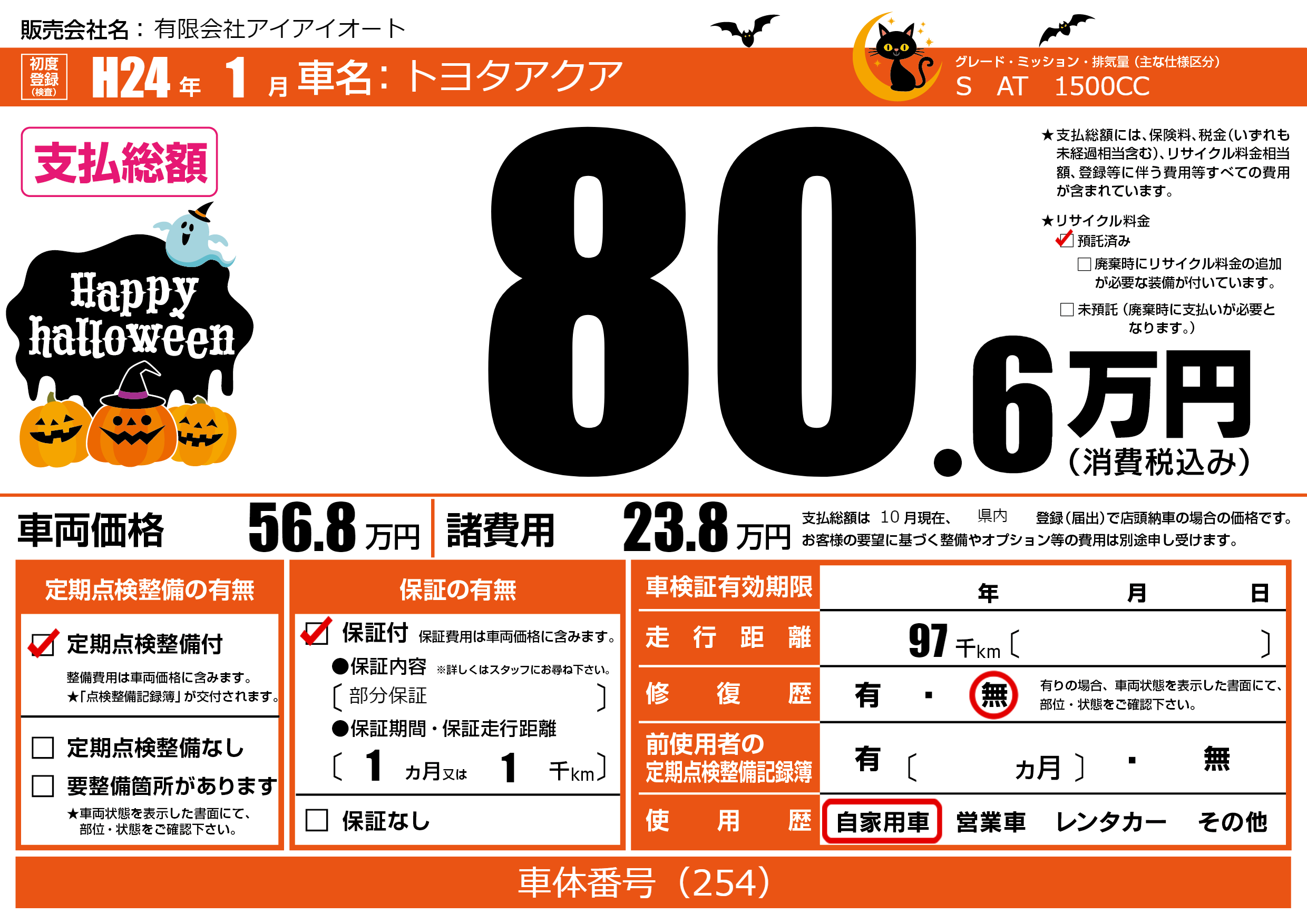 | 走行キロ | 9.7万km | 初年度登録 | H24年1月 |