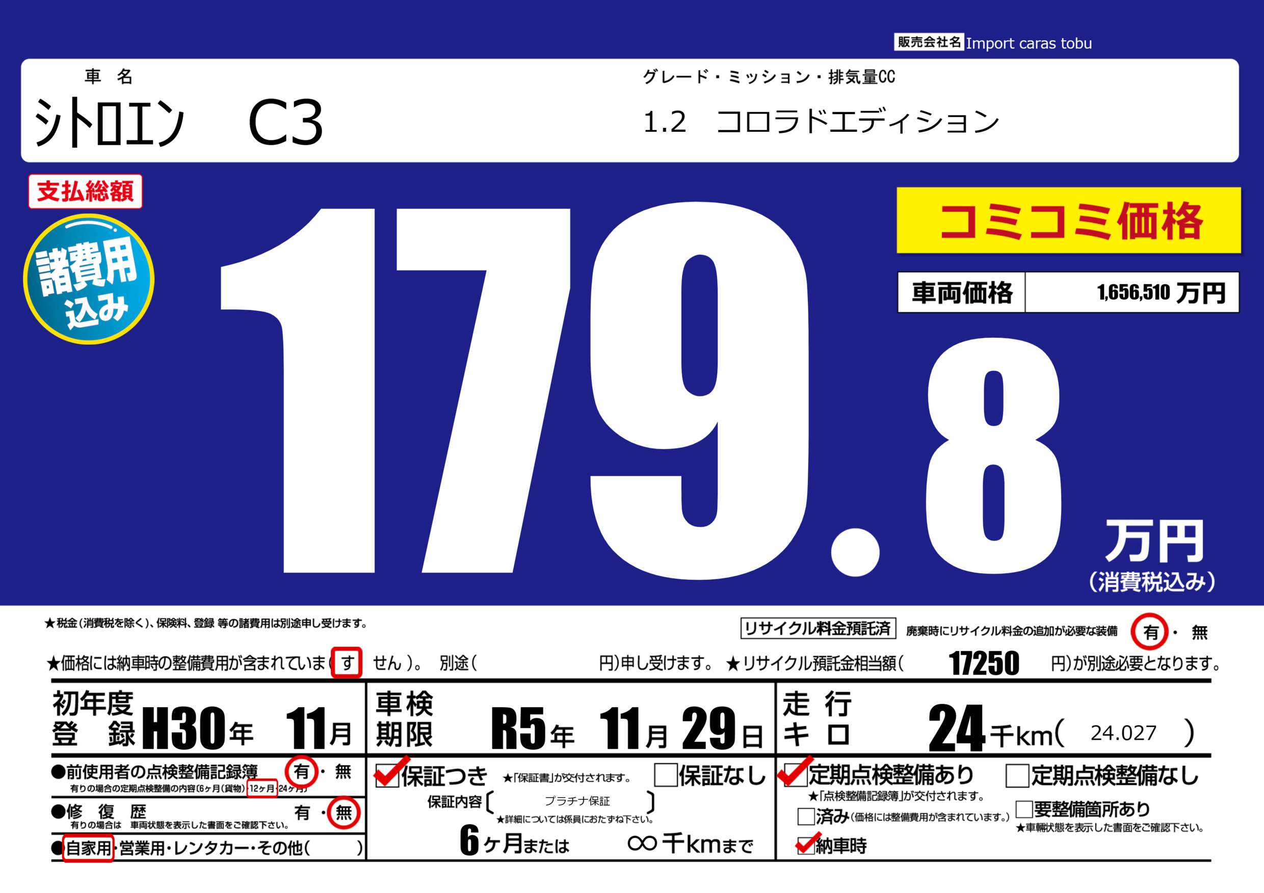 | 車名 | シトロエン C3 | グレード ミッション 排気量 |