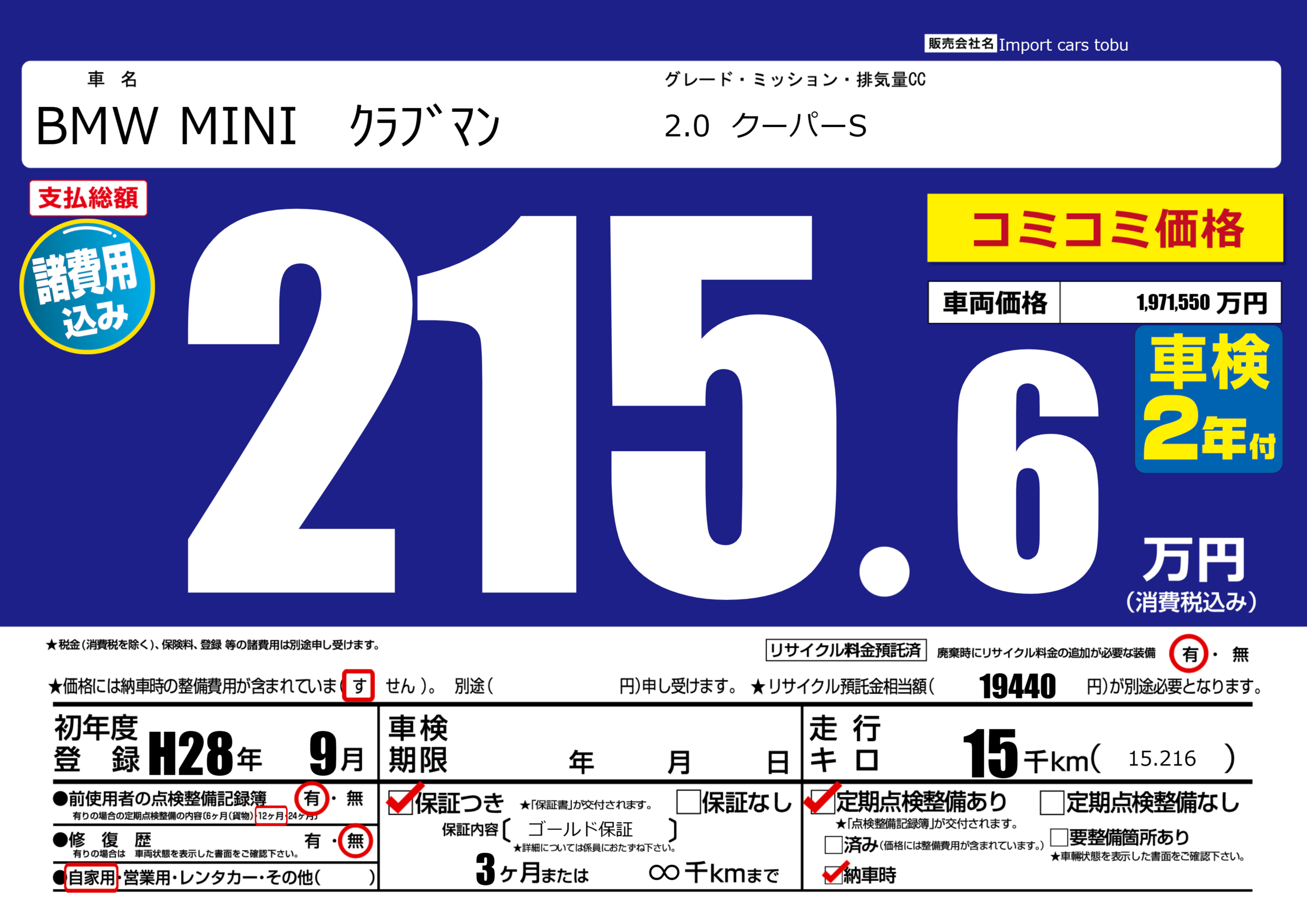 | 車名 | BMW MINI クラブマン | グレード ミッション 排気量 |
