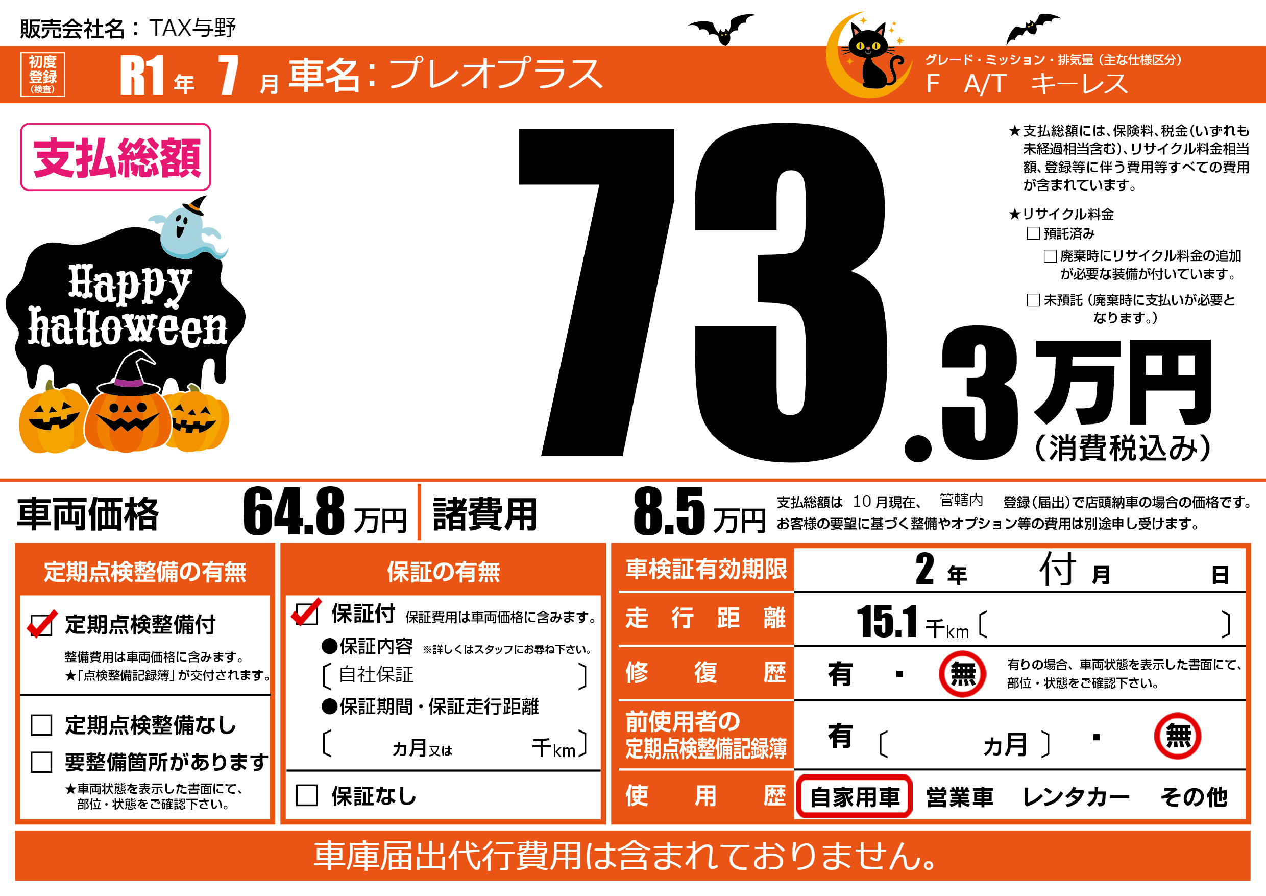 | 走行キロ | 1.5万km | 初年度登録 | R1年7月 |