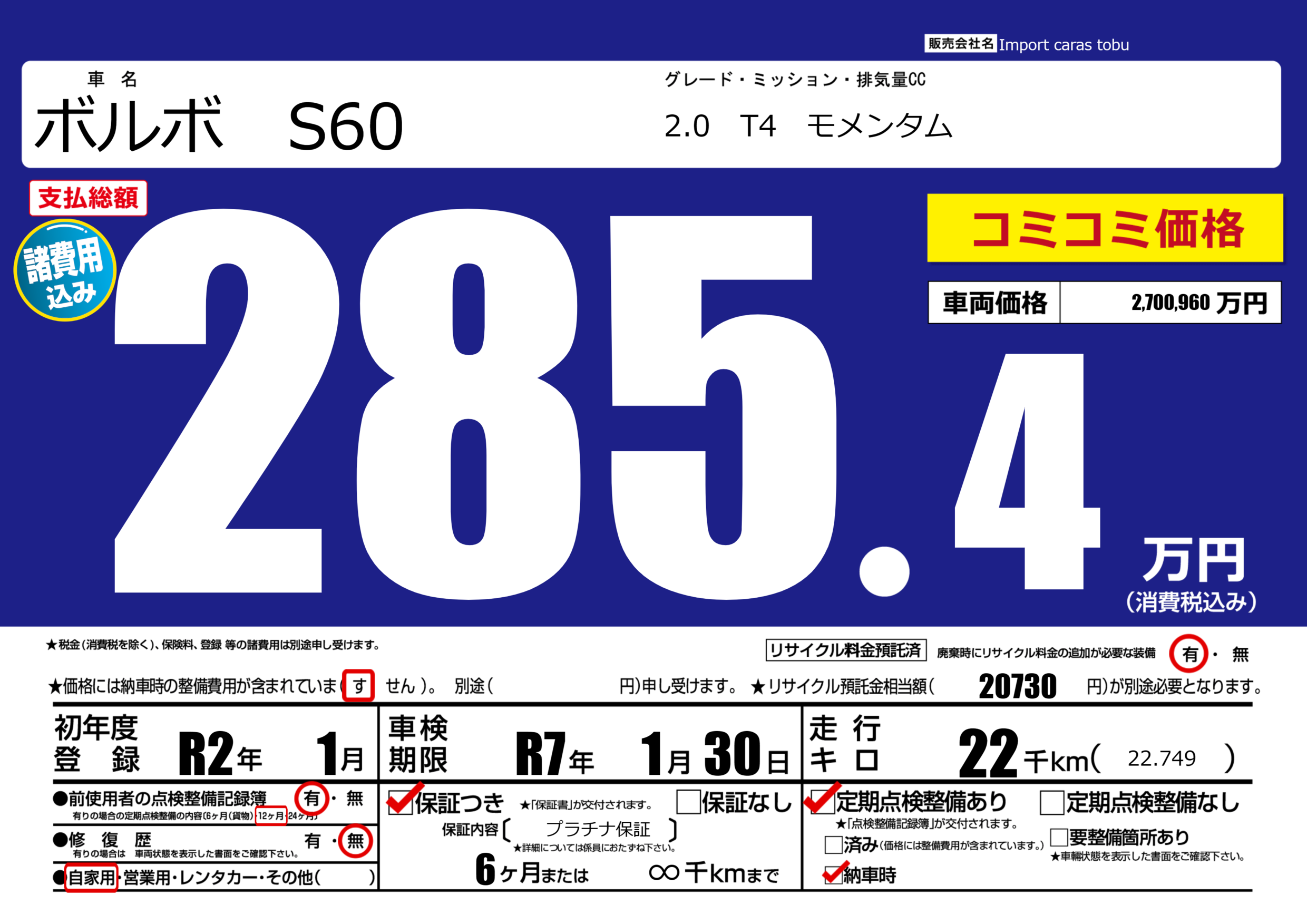 | 車名 | ボルボ S60 | グレード ミッション 排気量 |