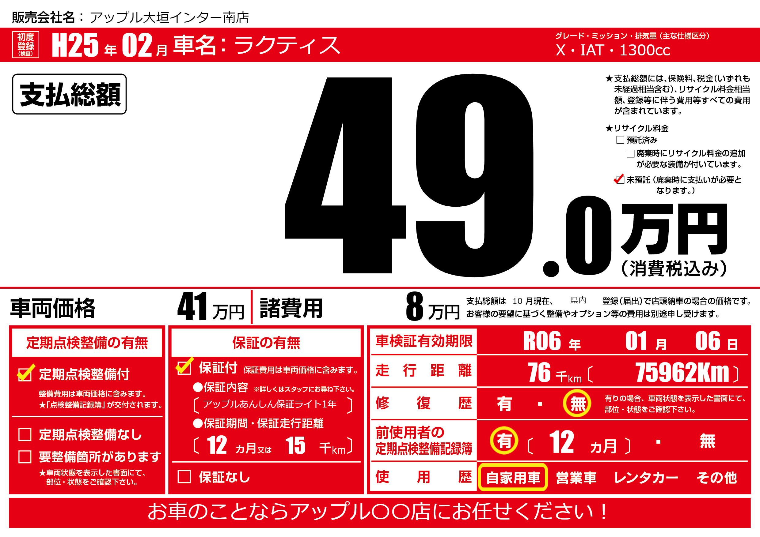 | 車名 | ラクティス | グレード ミッション 排気量 |