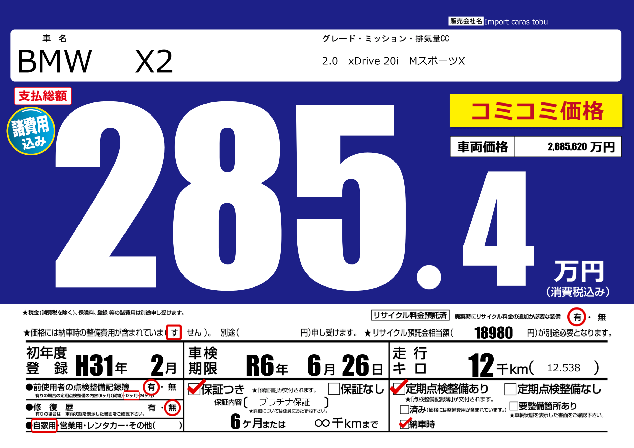 保証付き 保証内容( プラチナ保証) 6ヶ月または(∞)千kmまで |