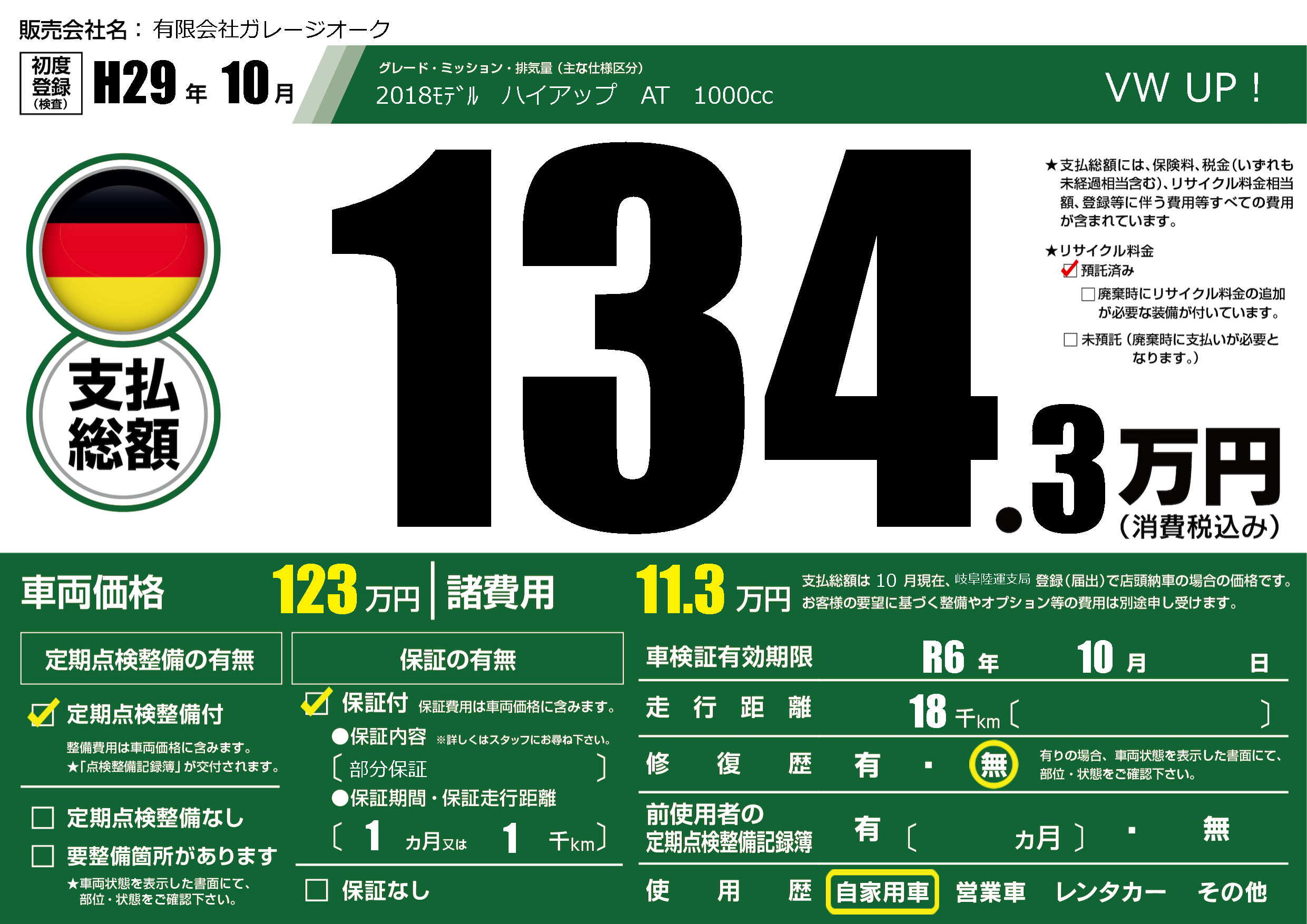 | 車名 | VW UP! | グレード ミッション 排気量 |