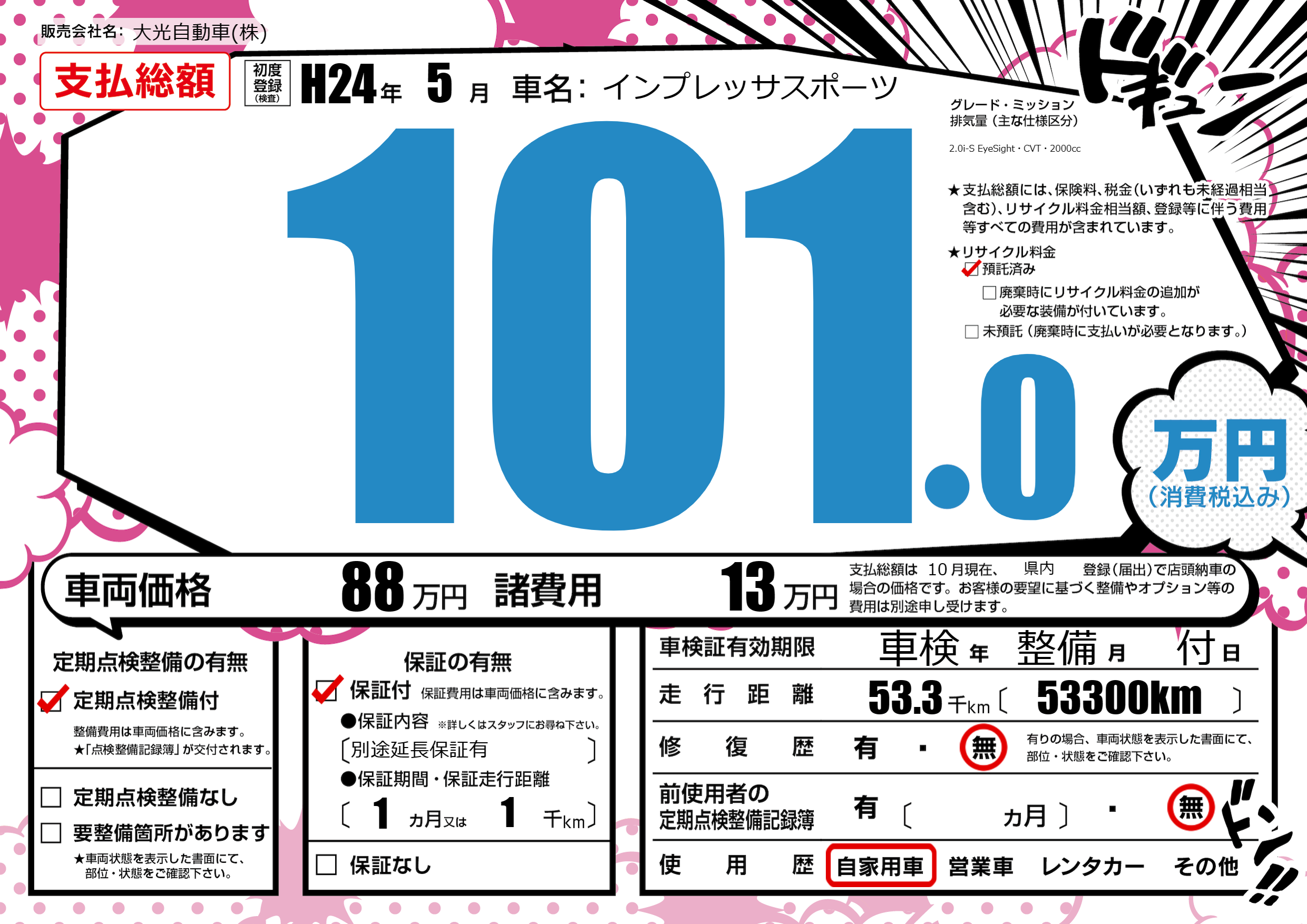 | 車名 | インプレッサスポーツ | グレード ミッション 排気量 |