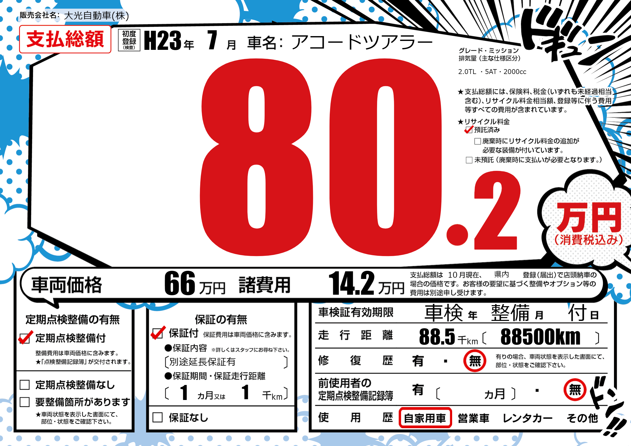 | 走行キロ | 8.8万km | 初年度登録 | H23年7月 |