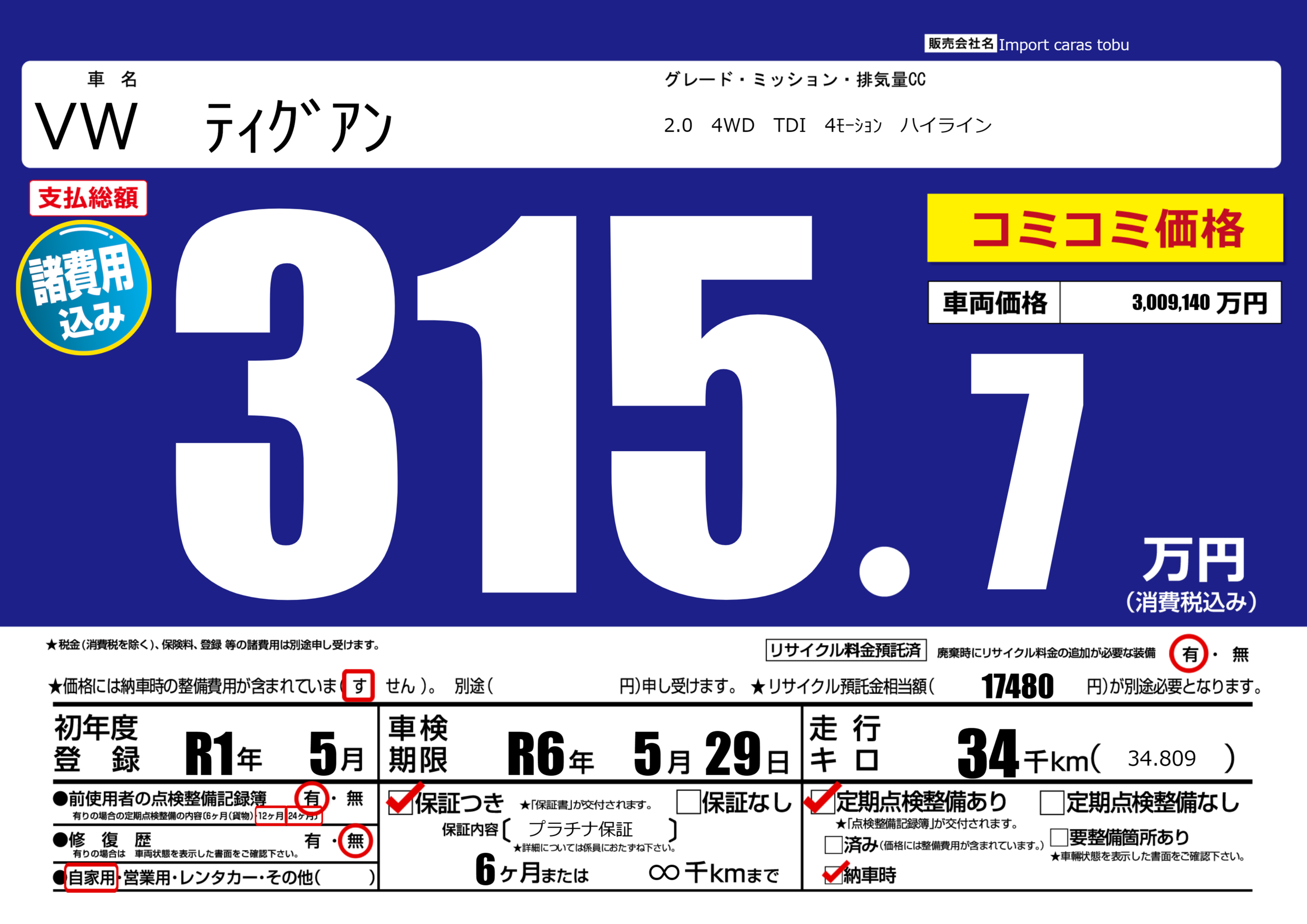 | 車名 | VW ティグアン | グレード ミッション 排気量 |