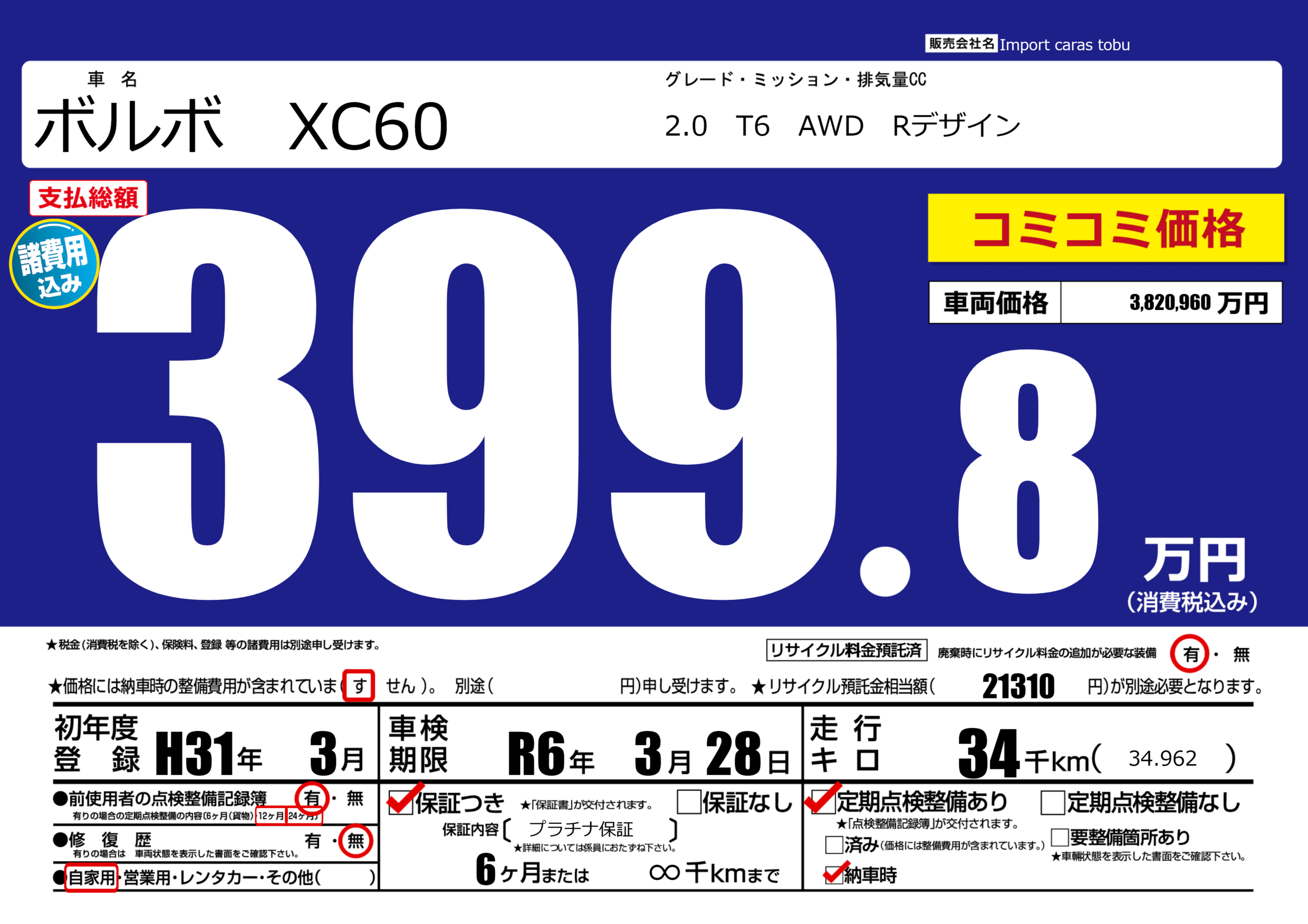 | 車名 | ボルボ XC60 | グレード ミッション 排気量 |