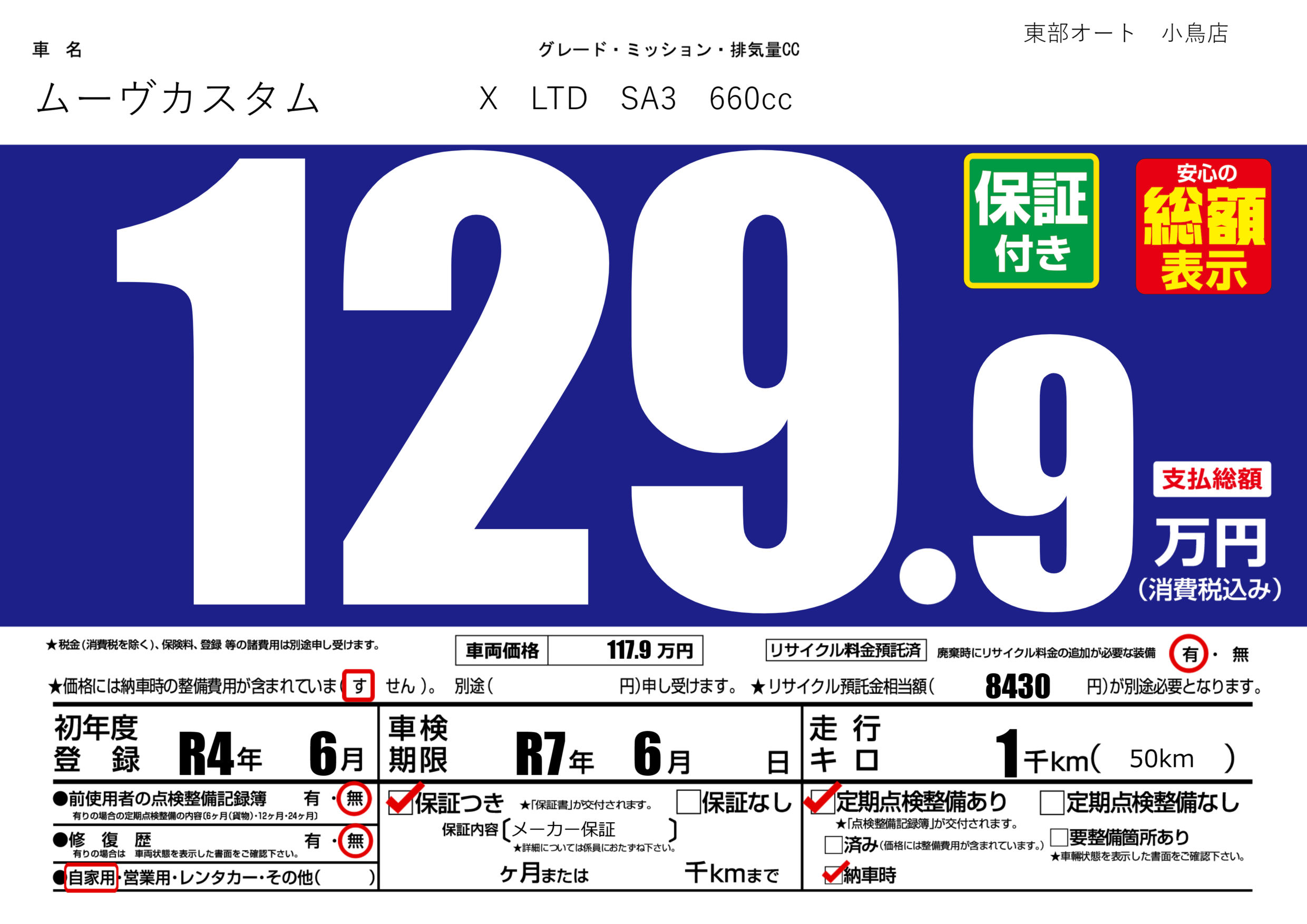 | 走行キロ | 0.1万km | 初年度登録 | R4年6月 |